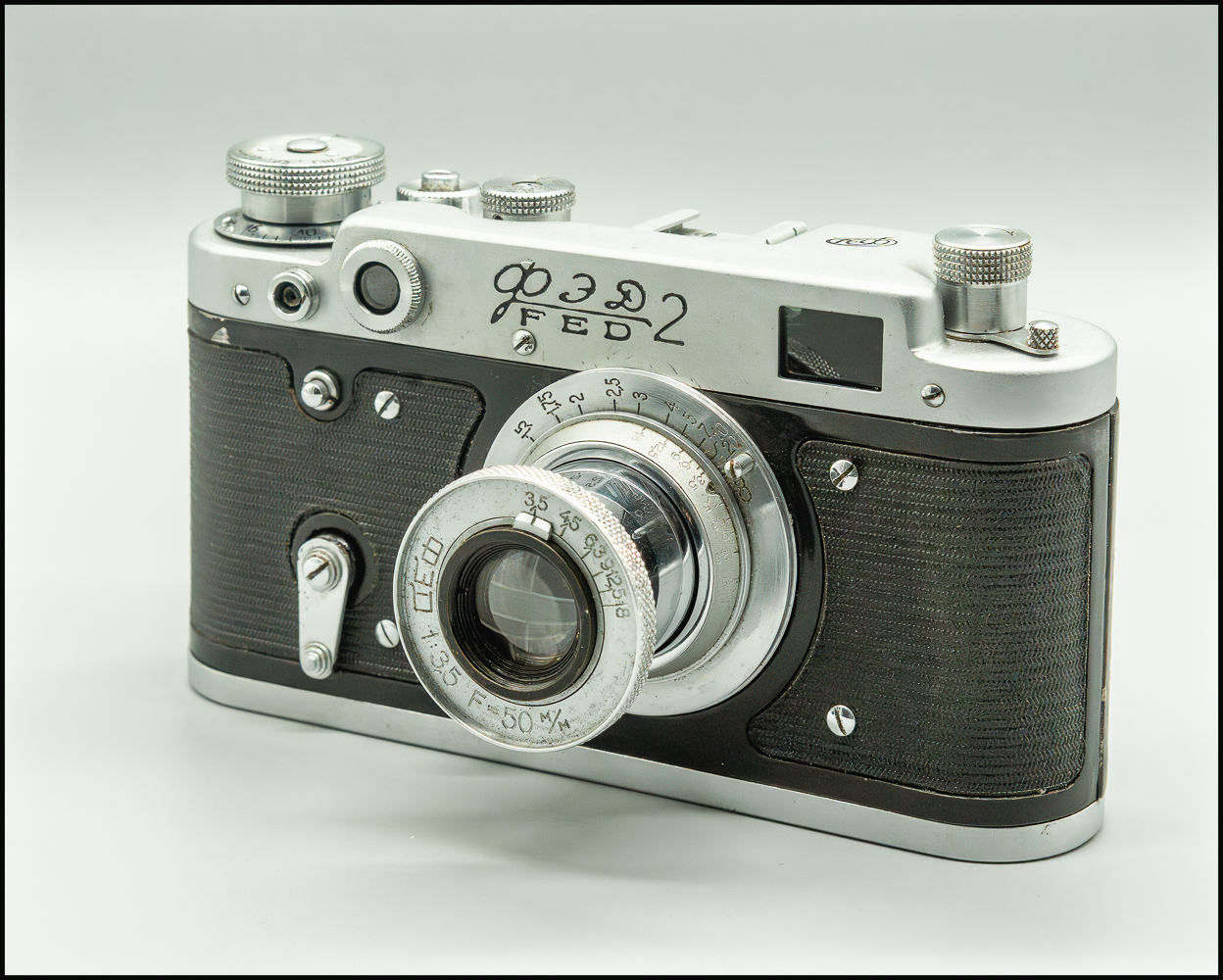 They both use Leica Thread Mount (LTM or M39) lenses: a 50 mm f/3.5 collapsible FED 10 lens. It’s said to be a copy of the 5cm f3.5 Leitz Elmar. However, I’ve read that although it looks like an Elmar, its design is actually closer to that of a Zeiss Tessar 50 mm f/3.5 (the Leitz Elmar has the aperture located behind the first element, the Zeiss Tessar has it behind the second element). The FED-10 was manufactured from 1934–1946(?) This one has the old-style aperture scale f/3.5, 4.5, 6.3, 9, 12.5, 18 and a 50 M/M indicating that it was built before World War II. Post war lenses feature the new-style aperture scale f/3.5, 5.6, 8, 11, 16 and a 50 MM engraving.