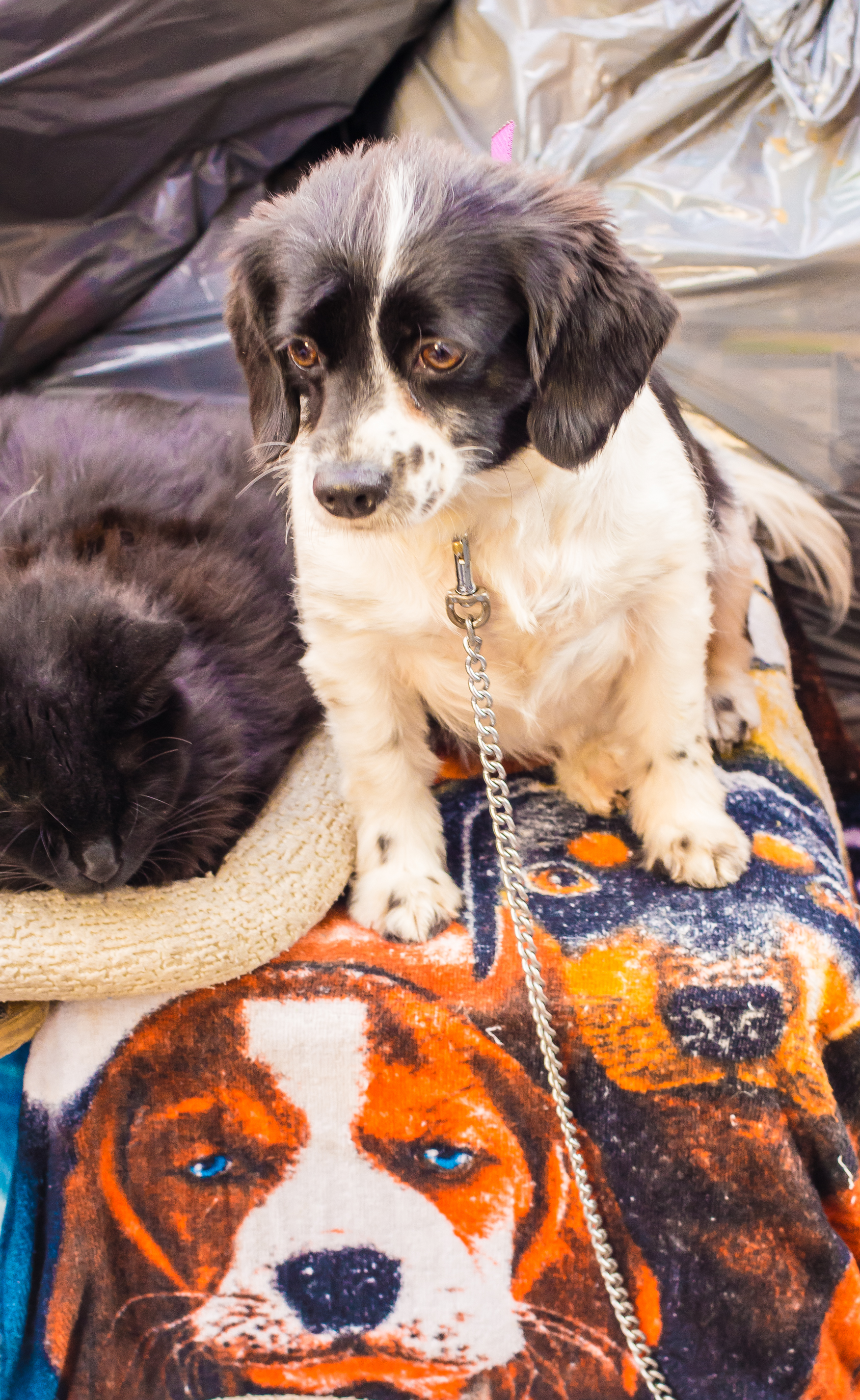 At an intersection somewhere between Union Square and Grand Central I came across this guy on the sidewalk. He had about five dogs, a number of cats and even two guinea pigs. I don’t know if he was selling them or if they were just for display. I was taken by this little dog. The picture is not as sharp as I would have liked it to have been but I liked the expression on the dog’s face and the intent way he/she was looking at something outside of the frame. I also liked to contrast between the largely monochrome (black and white) dog and the more colourful dog on the towel (if that’s what it is) that the dog is standing on. I also liked that while the real dog is looking out of the frame, the “towel” dog is looking directly at the camera, and that the real dog has a somewhat puzzled and vulnerable look, while the “towel” dog has an almost malevolent expression.
