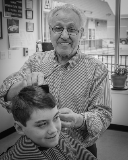 I had gone for a long overdue haircut. Usually I go somewhere else, but I had to drop my car off for some work so I just went to the closest place. I had never been there before. While I was getting the haircut one of the people working there (actually the owner I think) started talking about my camera. After I finished, and to my surprise, he suggested that I take some pictures inside the shop. So here he is, along with another customer. Interestingly his name was Mario.