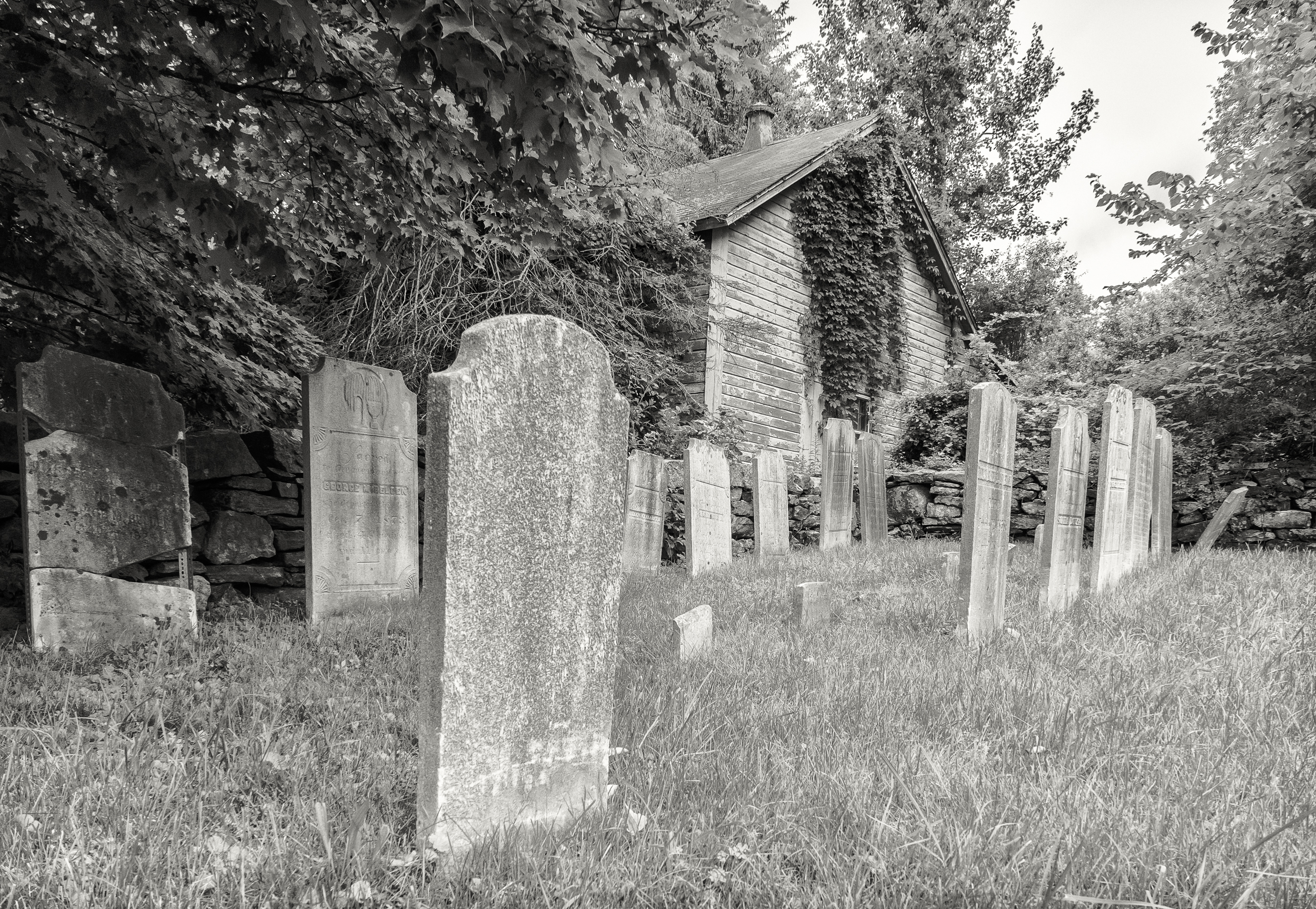 Gravestones with ivy covered building. North-west corner.