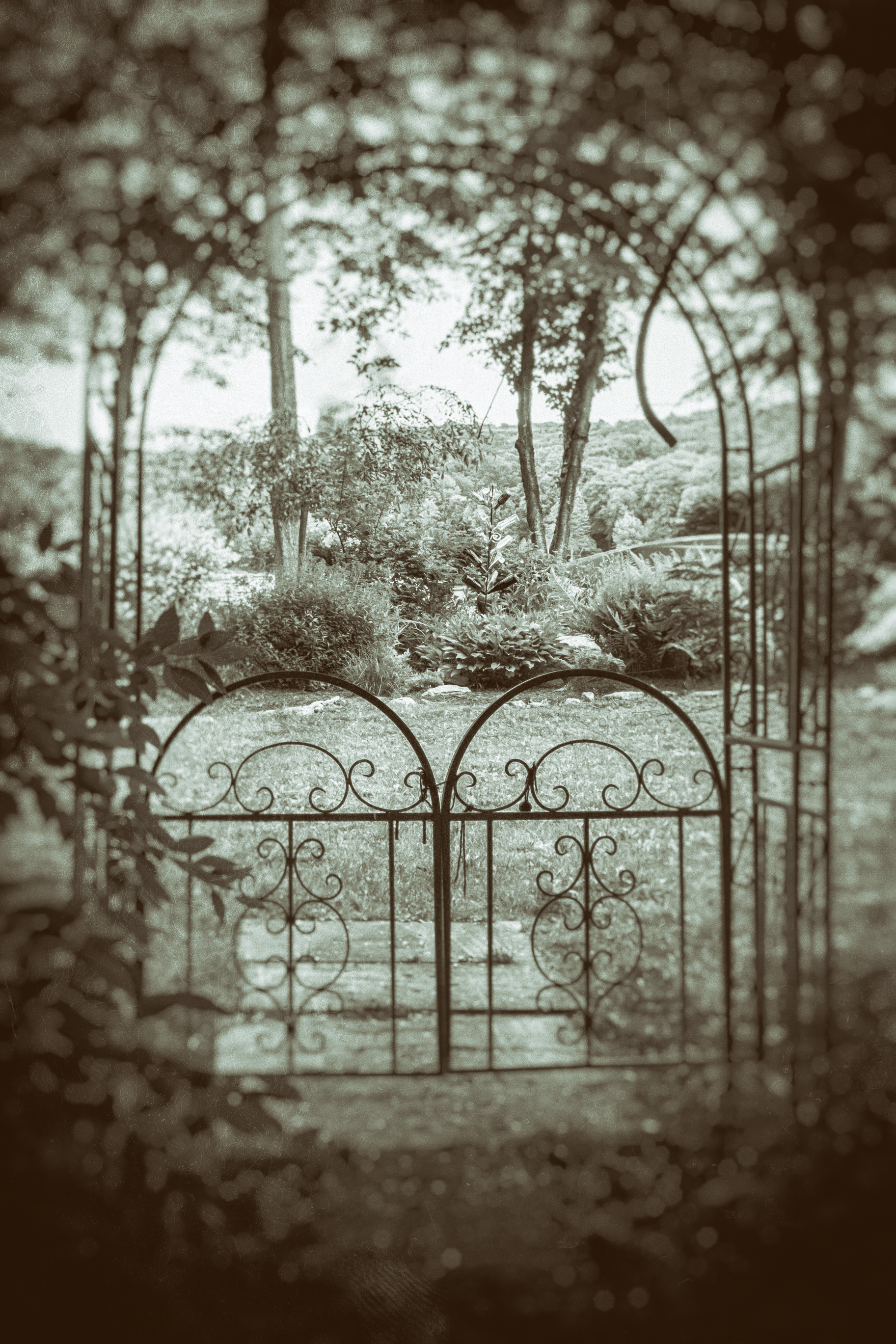 Well not really that secret. The garden belongs to one of our fellow Garden Club members. The main entrance is up on the road and the property runs down hill to the dock and the lake. However, there’s another entrance. Follow a small path down to the lake and just off it is this gate, which opens into the property at the bottom. I liked the way the gate framed the garden. I also thought that the “old film” look would work well.
