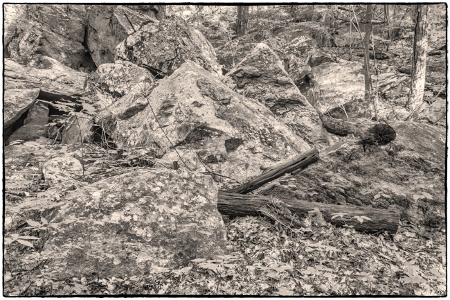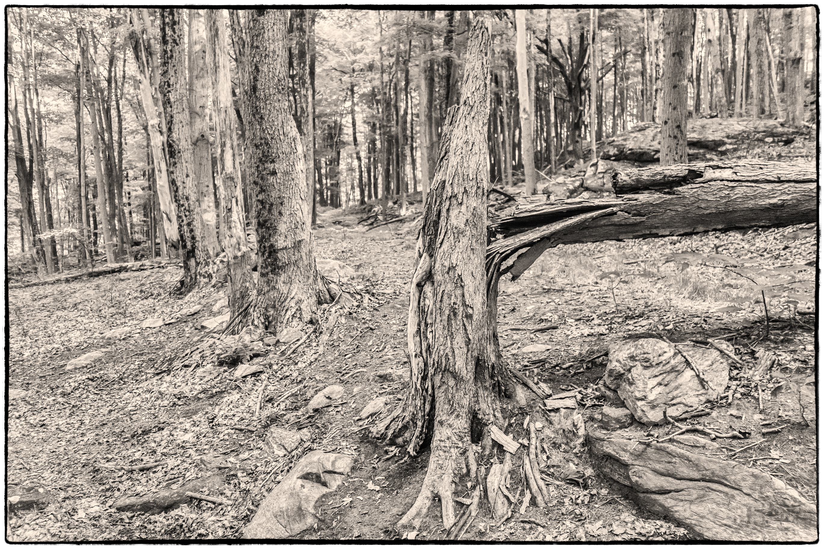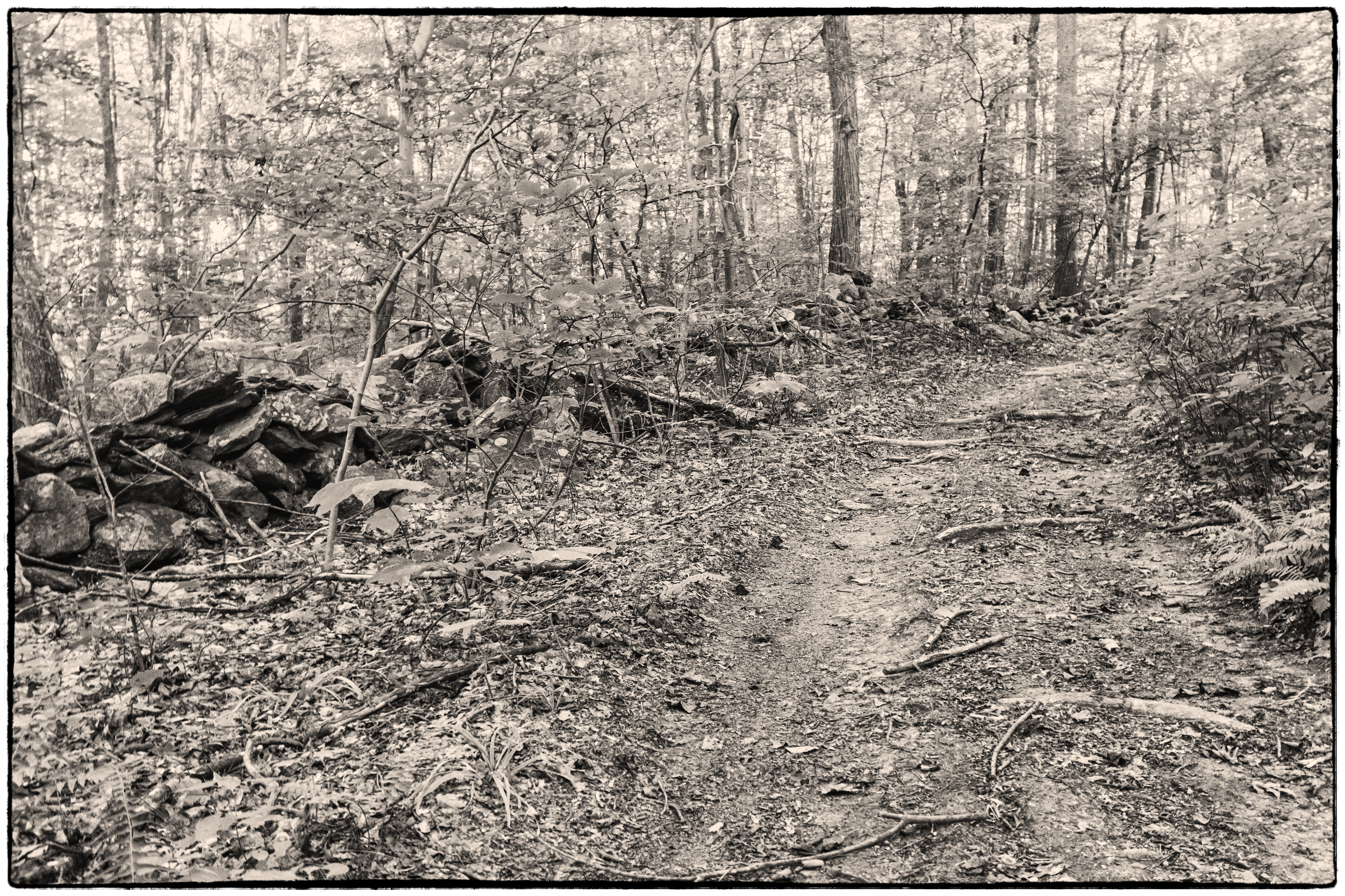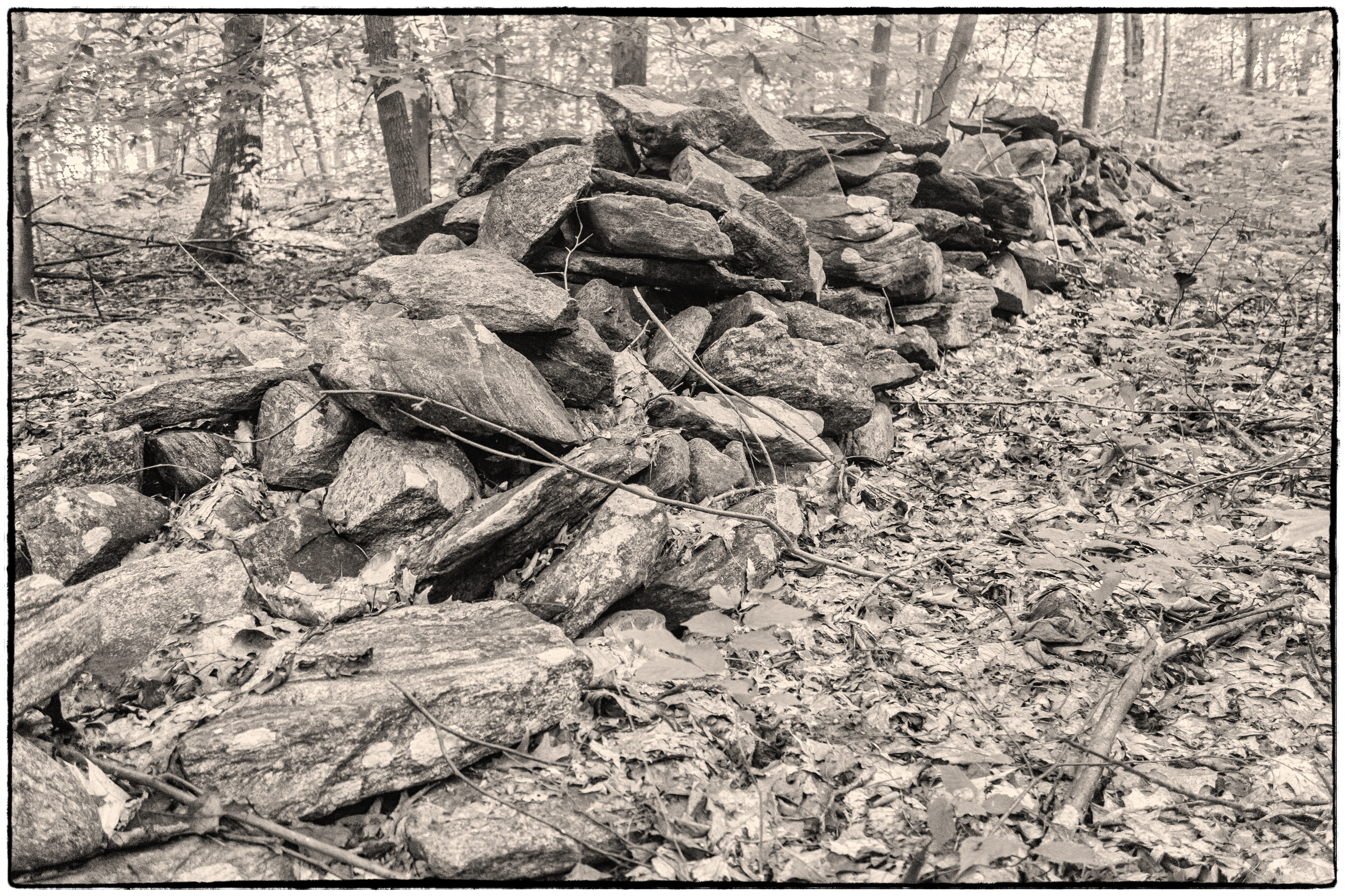 It’s a fairly typical Fahnestock trail: large rocks, stone walls, the occasional downed tree etc. There’s also one very short, swampy bit where I had to pick up Jackson and carry him across. He’d just had a bath and Eirah would have killed me if he got muddy. However, where most of the Fahnestock trails I’ve been to have been narrow, with undergrowth coming right up to the trail itself this one is wider. More along the lines of a woods/farm road than a hiking trail. The prevalence of ruined stone walls along the trail would seem to confirm that this is what it once was.