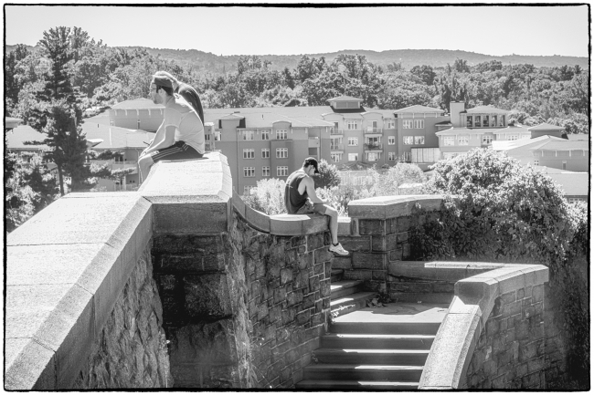 A group of people sitting outside on a nice sunny day soaking up the rays and enjoying a great Hudson River view. I liked the lines of curves of the walls, part of the remains of Rockwood Hall. Were they walkers like myself or perhaps employees of the retirement home in background on their break?