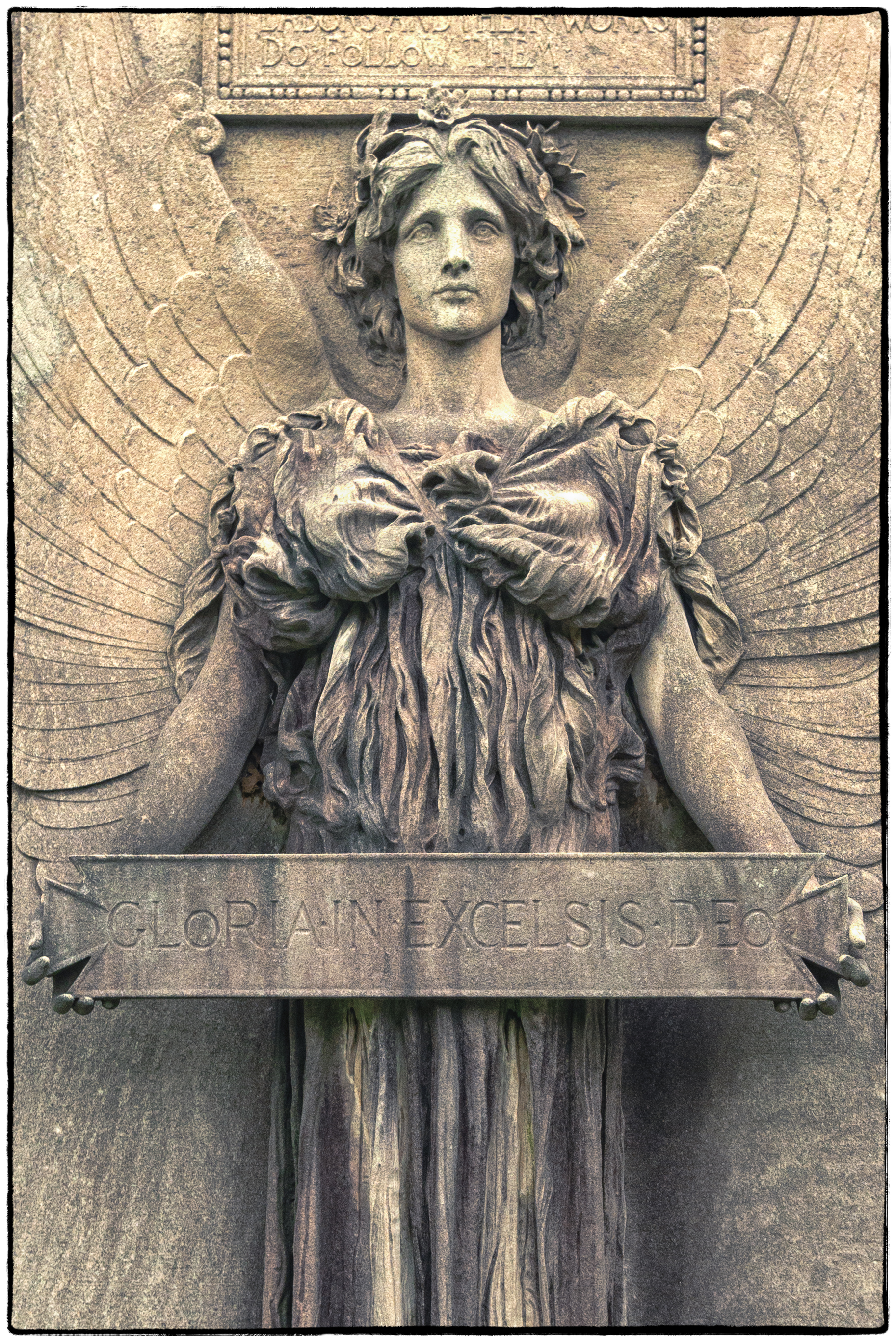 This is a monument to John Hudson Hall. It was carved by Augustus Saint Gaudens, who is remembered as one of the greatest American sculptors. This winged figure is a variation of another of his works, called “Amor Caritas,” which can be seen in bronze form at the Metropolitan Museum of Art in New York City. In my opinion, however, this stone version with a different pose is by far the superior achievement.