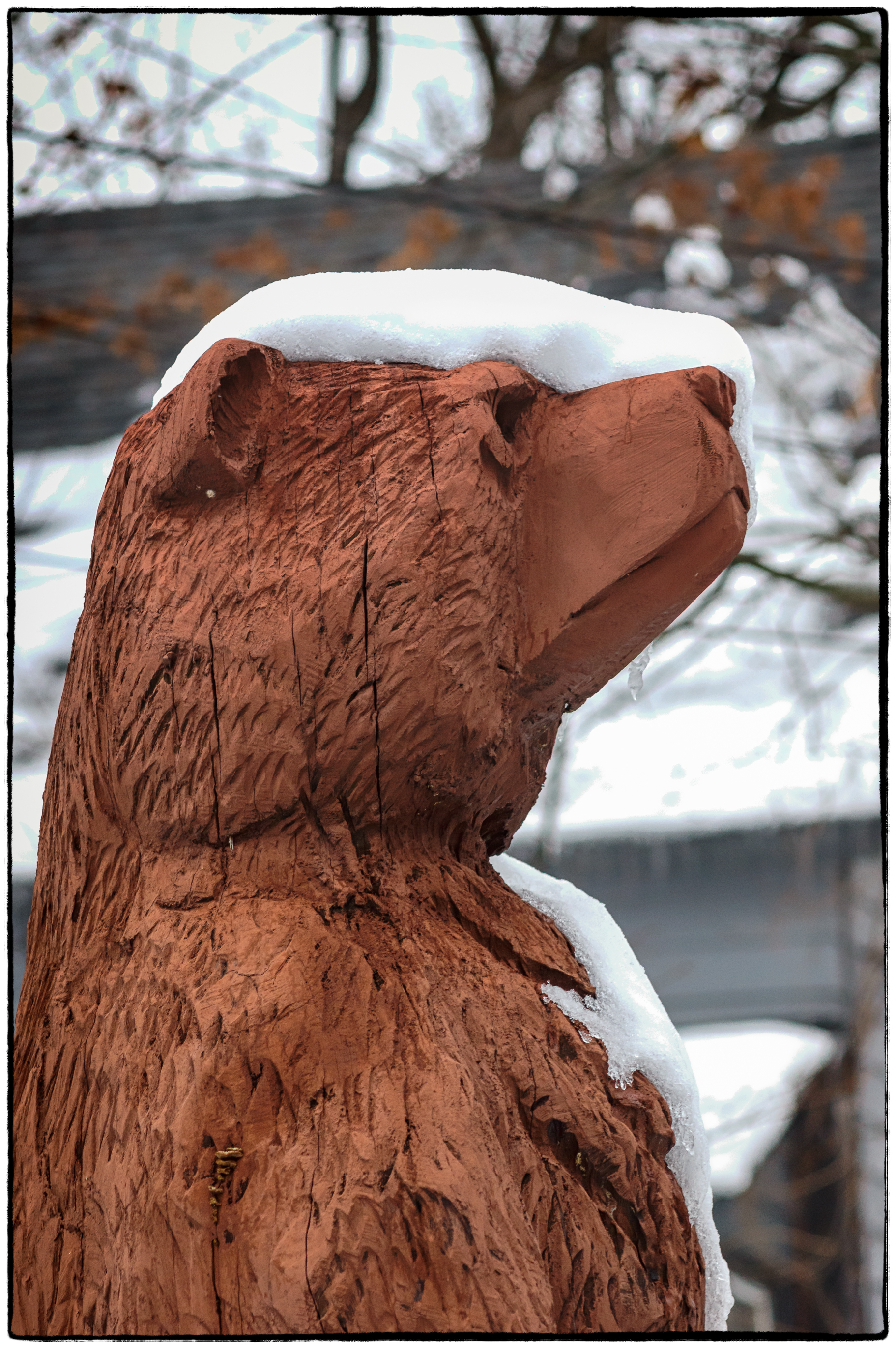 This wooden bear is huge! Surely larger than life size. Bears can’t get this big can they? If they can I hope I never meet one. Come to think of it I don’t think I want to meet any kind of bear in the wild – even a small one. I thought it was somewhat quirky, especially with the snow on its head.