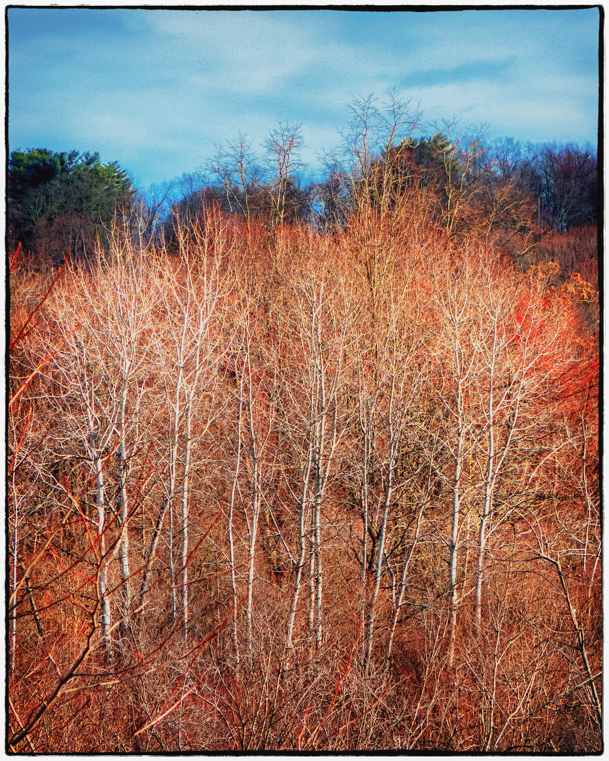 While walking around the Cortlandt Town Center shopping area in Mohegan Lake I noticed these trees in the distance, the light picking out their white trunks.
