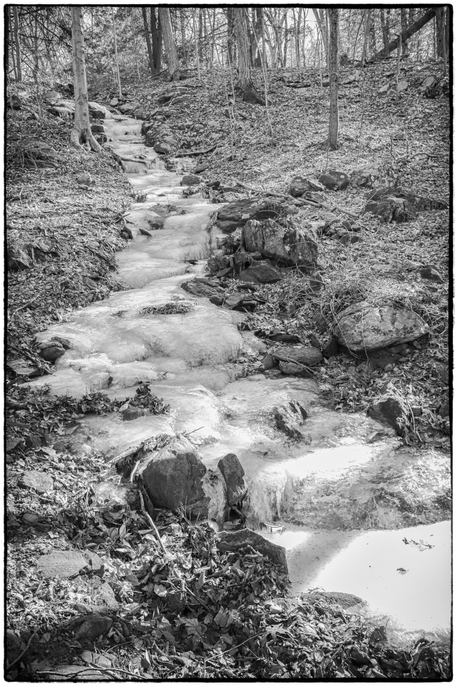 While walking the dog I came across this frozen stream bed. I’d walked along this trail in the past and had tried to get pictures of the stream when it was flowing. Somehow the light shining through the trees (which usually had leaves when I was trying to take the picture) was too contrasty and I could never get a shot that pleased me. Now it’s winter and the leaves are of the trees and the light was flatter. I’m much more satisfied with this one.