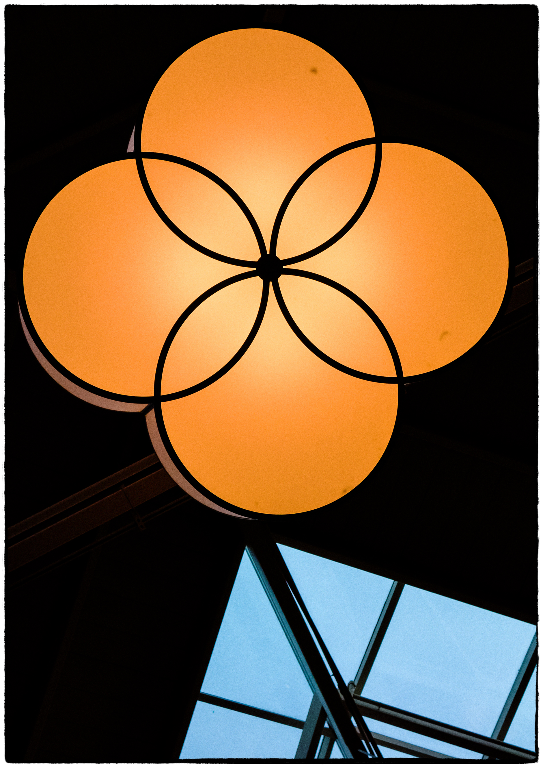 Another one taken inside the Danbury Fair Mall. I was having a coffee while waiting for my wife to finish shopping and I leaned back in my chair and looked up to see these lights outlined against the ceiling and skylight. The lights reminded me of flower petals and the diagonal girder (or whatever it is) of a stem. The warm color of the lights and the blue of the sky made a nice change from the ice and snow outside.