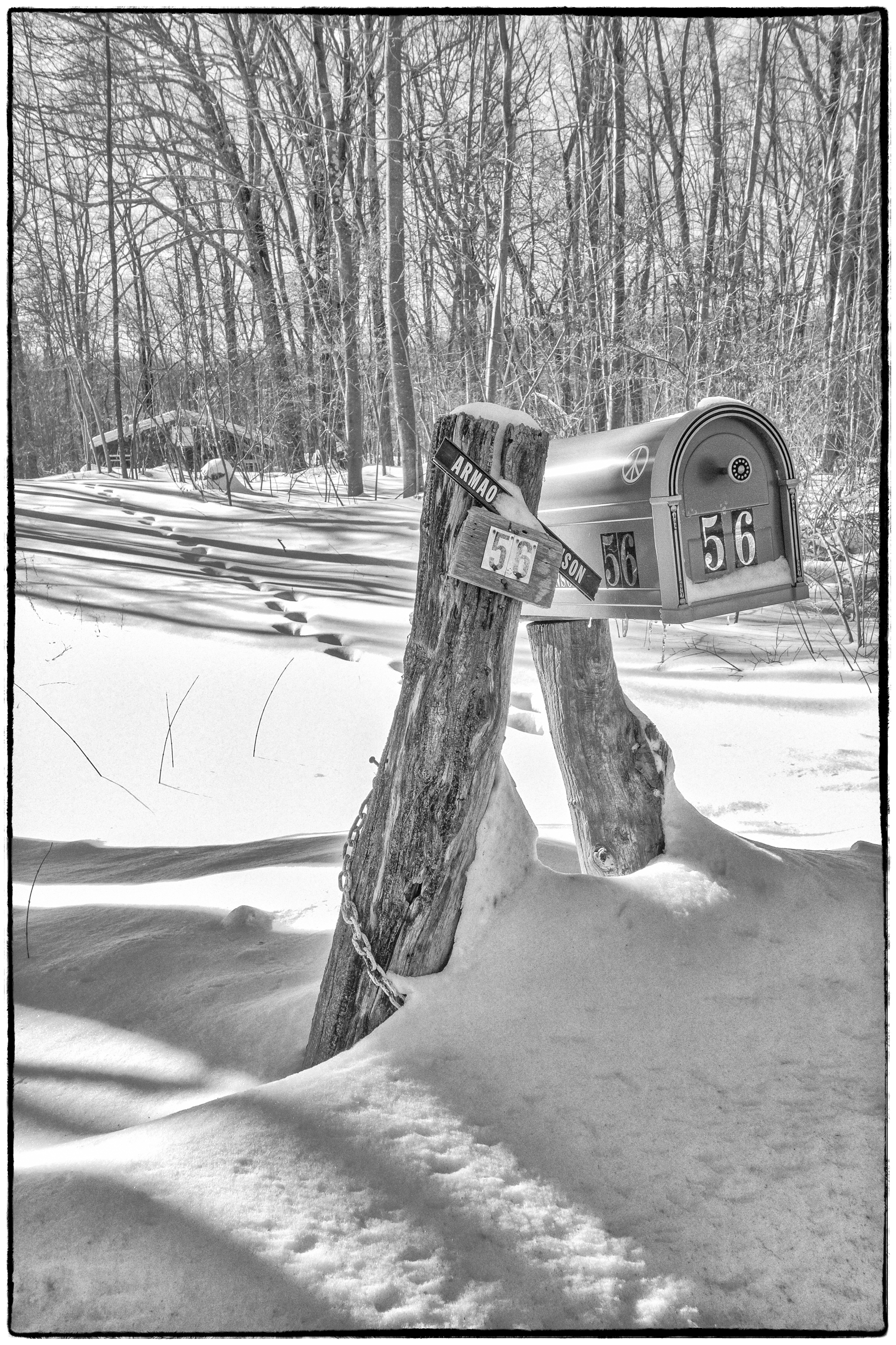 Another ‘dog walk’ picture. We’d walked around the lake and I’d noticed the mailbox and the footprints in the snow receding towards the building in the background so I took a picture of it. I guess I was a bit tired after the walk an didn’t look at the resulting image. When I got home I put the pictures on the computer for editing and discovered that the framing was off – far too tight. So I went back and tried again.