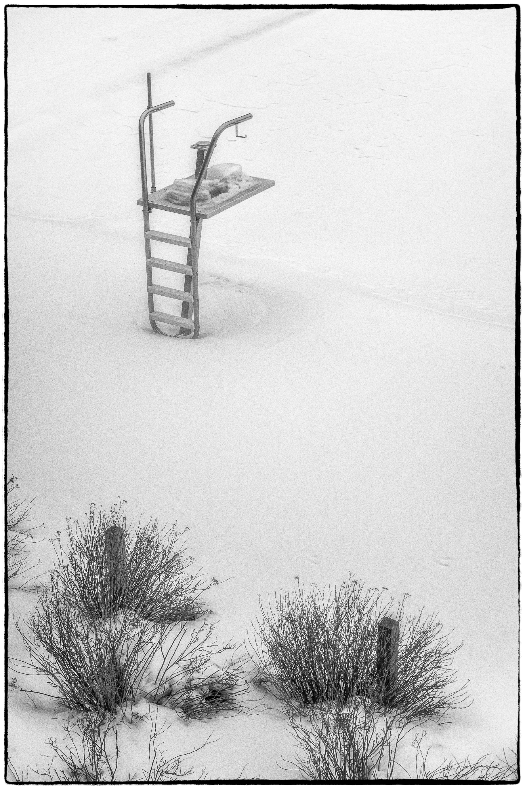 Our local park has a kind of pavilion (somewhere with tables where you hold events, eat your food etc.) overlooking the town pool. I was in the pavilion looking down on the now frozen and snow-covered pool when I saw this structure – presumably a frame to attach a diving board to. It seemed so incongruous and diving from it in the heat of the summer seemed so far away. Diving from it in the heat of the summer seemed so far away.
