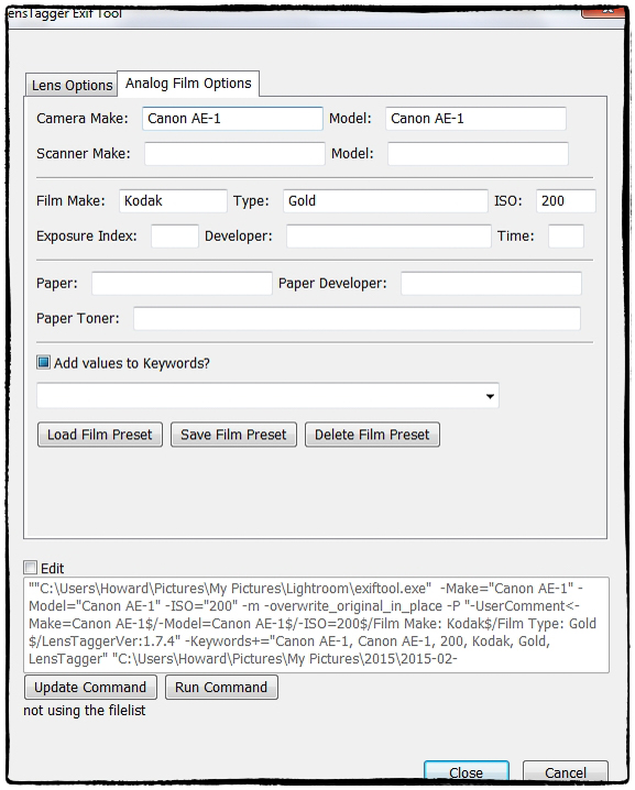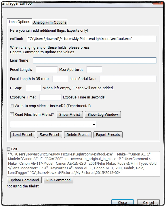 I’m fond of film photography. I also like to use legacy lenses. One of the main reasons I bought my Nex 5n was that it could, with appropriate adapters, use a wide variety of older, often less expensive, legacy lenses. Of course when negatives are scanned they don’t come with metadata telling you about the lens used, the film used etc. Legacy lenses used on digital cameras provide quite a bit of metadata, but nothing on the lens used. Of course you can always add this information as a tag, or a keyword, or in a description, but this has always seemed to me to be less than optimal. So I was pleased to come across LensTagger. It operates as a Lightroom plugin. Select an image (or images), invoke the plugin and (after prompting you to save the existing metadata to a file) up pops the screen above inviting you to add information about the lens used. Click the second tab and you get the screen below prompting you to provide details of the camera and film used. Press ‘Update Command’ and after it completes close the window. While the files are still selected choose ‘Load Metadata from file’ and you’re done. A little bit clunky, but not too bad. You can now select the legacy lens from the ‘Metadata’ section of the ‘Library Filter’ in Lightroom. NOTE: ExifTool by Phil Harvey must be installed for the plugin to work.