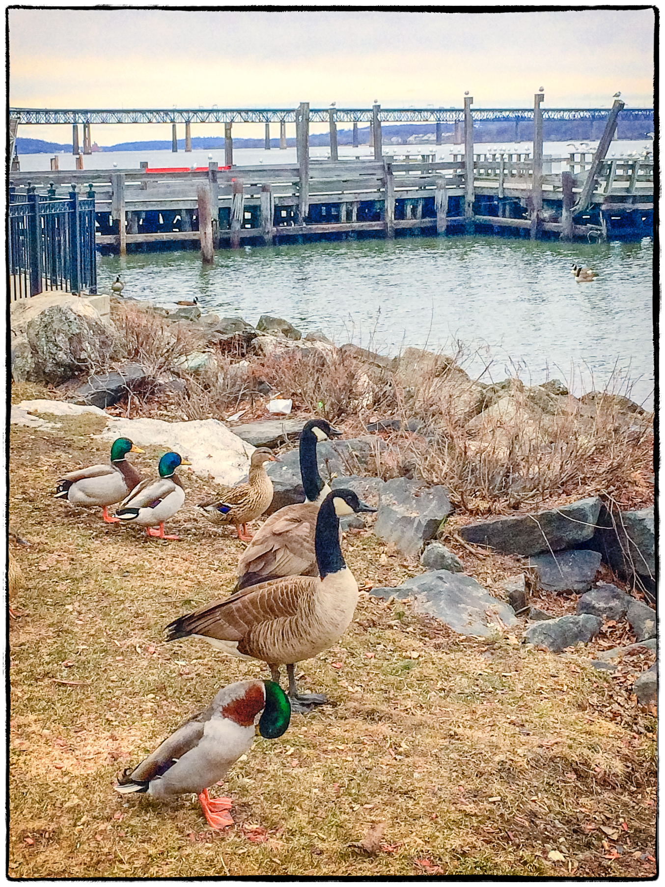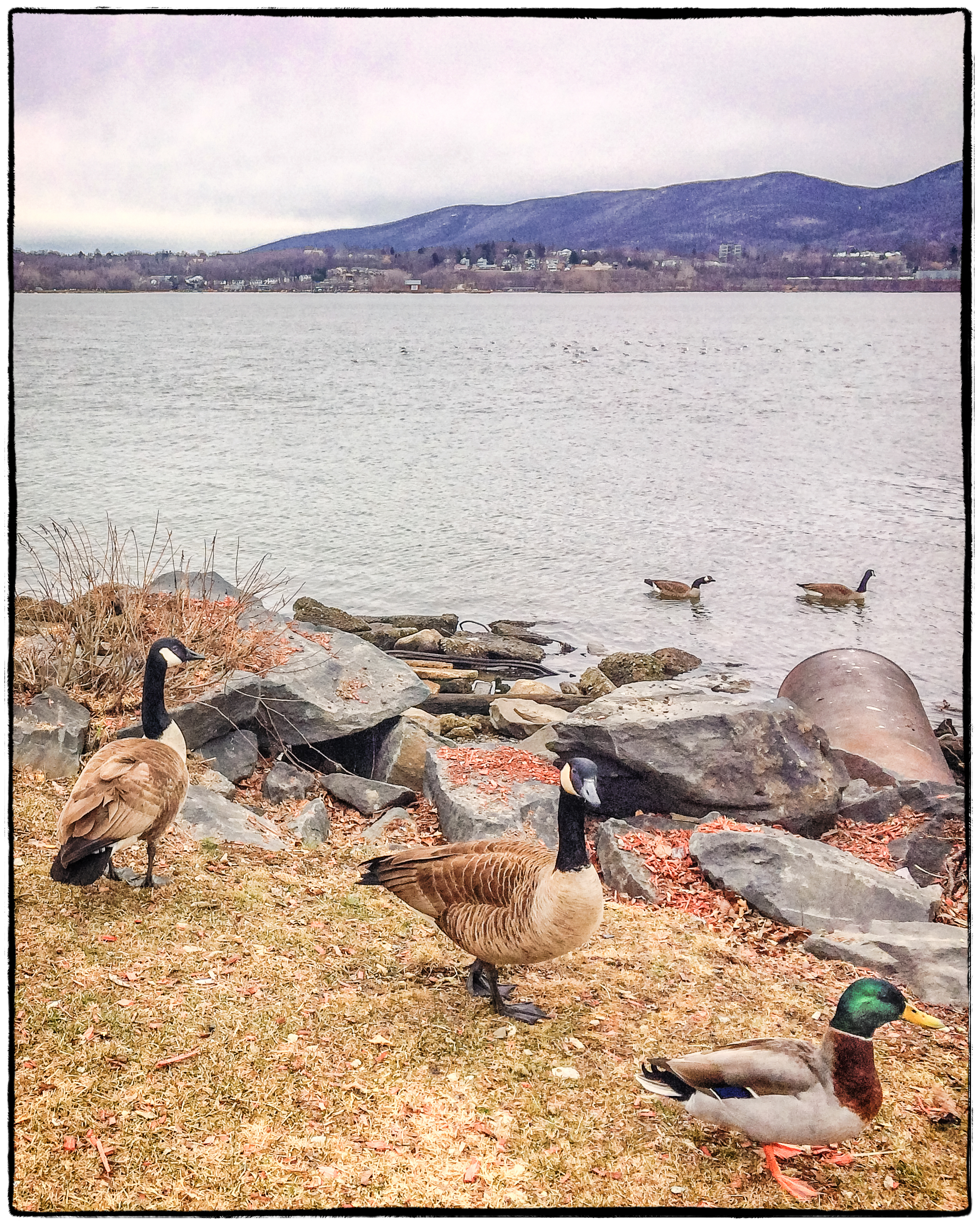 As mentioned in the previous post March 31 was my wife’s Birthday. Since she’s fond of fish and all kinds of seafood we thought we’d try Captain Jake’s Restaurant on the Newburgh waterfront. After a nice meal: Surf and Turf for my wife and a Ribeye steak for me we took our dog for a short walk along the waterfront. Our previous dog would have chased the birds, but not Harley. He just calmly walked by them.