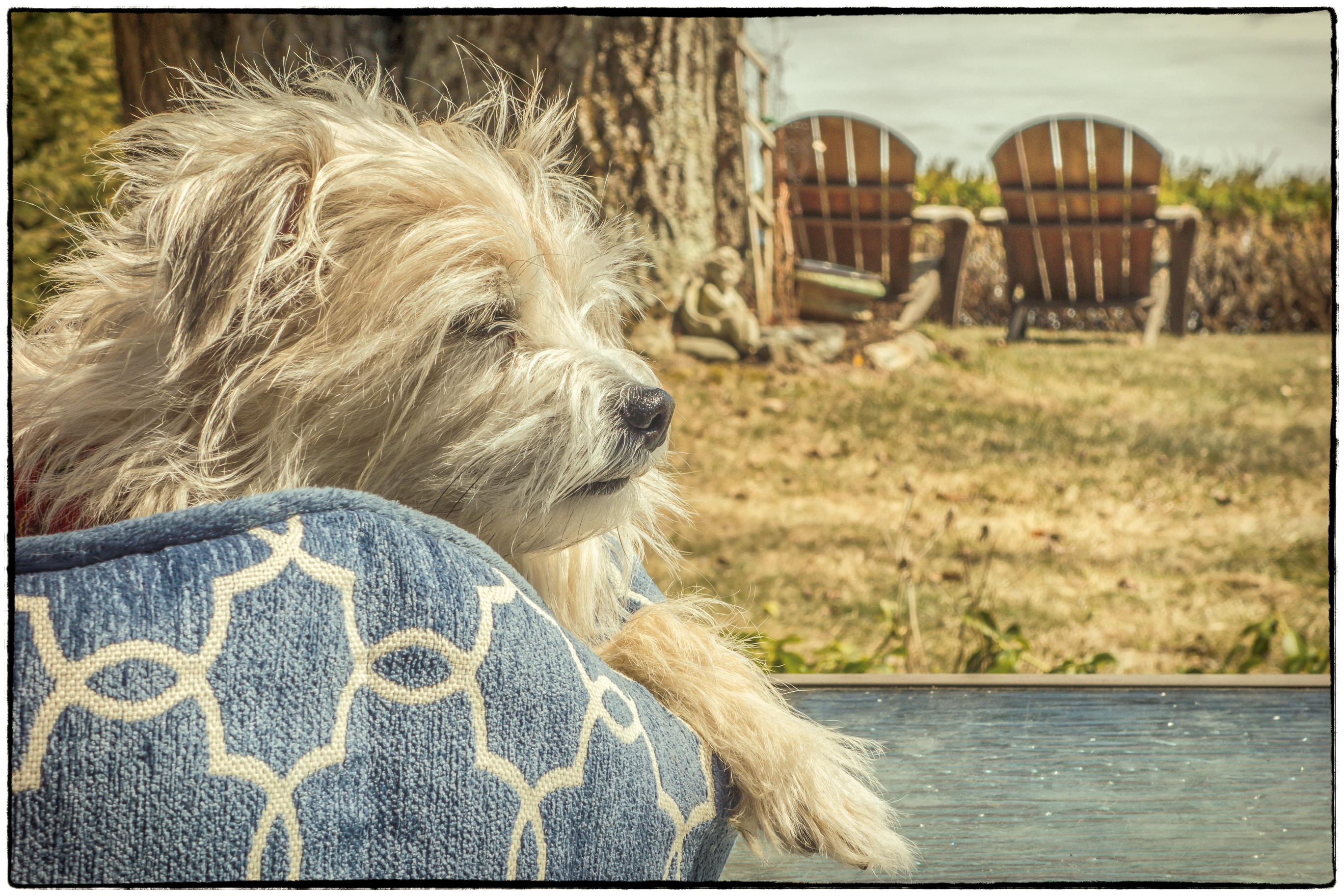 It was a gorgeous sunny day the other day: warm with blue sky and no clouds. I put Harley’s bed on our patio table and he lay there for some considerable time looking out over the garden and the still frozen lake. I too sat at the table, reading, drinking rum and coke and watching the last, tiny piece of snow melting on our patio. What an exciting life I lead.
