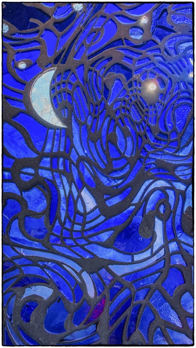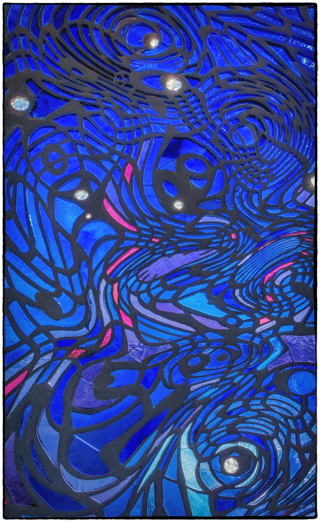 After wandering around on the riverfront in Peekskill I took the train down to Scarborough (the closest station to our house in Briarcliff Manor) where my wife was going to pick me up. We planned to go to a presentation on “Historic Downtown Ossining” given by the Ossining Historical Society at the Ossining Boat and Canoe Club. When I got off the train I noticed these stained glass windows on the river side of the platform. Apparently they make up part of “Untitled with Sky” (2010), stained glass windows and sculptural sitting facilities. They are by Liliana Porter in collaboration with Ana Tiscornia. There are supposed to be six panels, but I only noticed three. Maybe the others are now elsewhere in the station – perhaps on another platform. The MTA describes the work as follows: