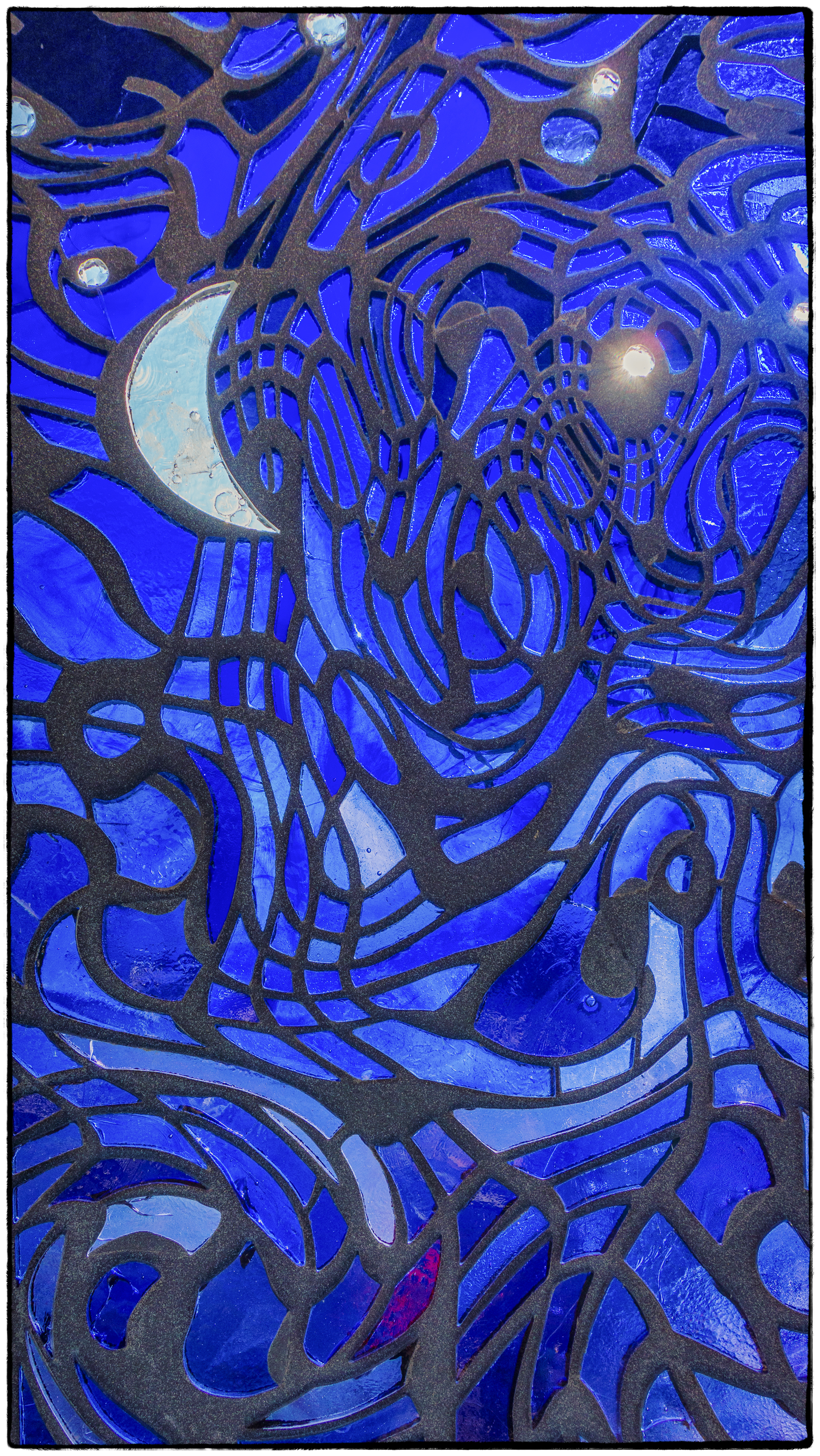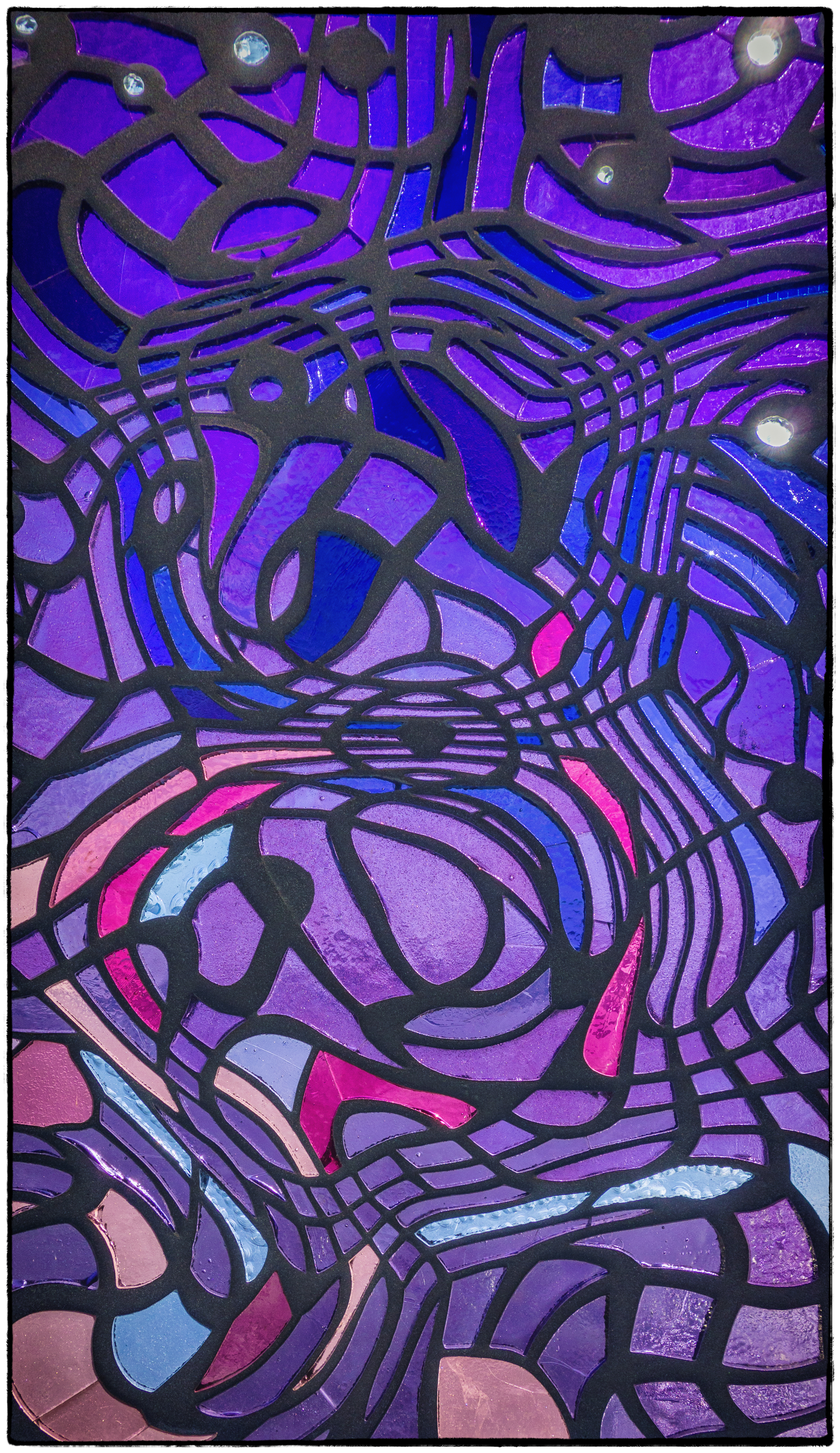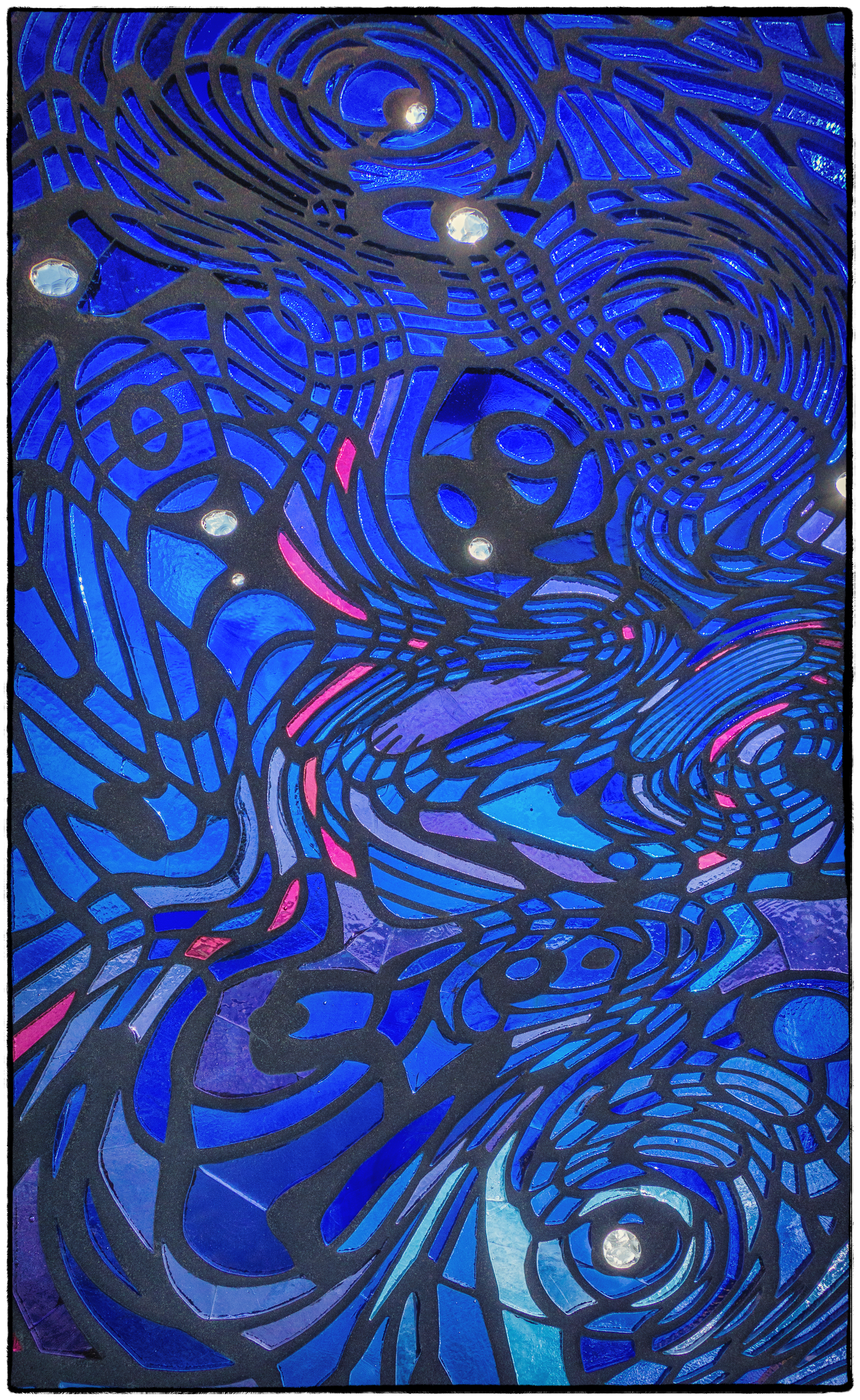 Untitled with Sky explores the boundaries between illusion – six faceted glass windows and twelve sculptural seats clad in mosaic that depict a beautiful sky as it changes from morning to evening – and “truth,” – the actual sky as it appears on either side of the art glass. Created in swirling, curved shapes in a variety of blues, purples, and rose, the work brings color and brightness to the platform where commuters wait for their morning train. The sculptural seats echo the contours and color of the windows and provide an amenity for Metro-North customers.