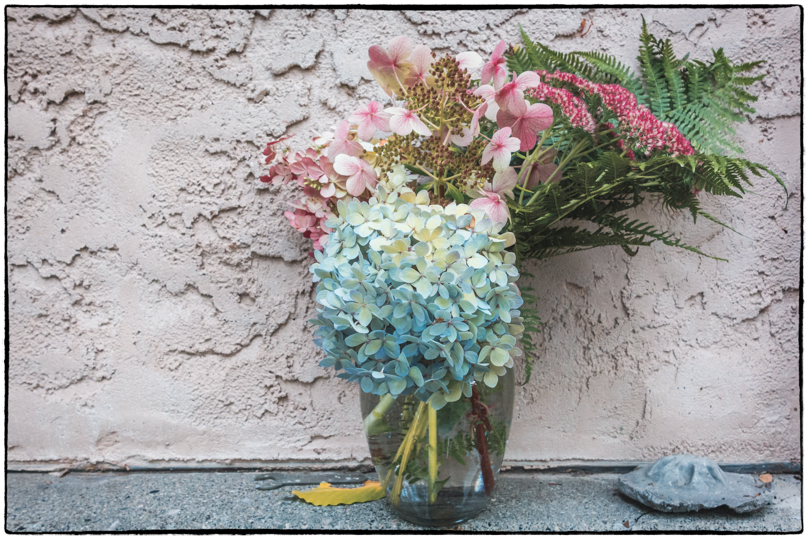 We were recently invited over to some friends for drinks and appetizers. Their house has a nice outdoor area with a fishpond overlooking one of the coves on our lake. I was sitting there talking to some people when I noticed this vase of flowers sitting on a ledge. Something about it caught my eye. Maybe it was the pastel colors of the flowers combined with the grey of the ledge and the rose colored stucco behind? Maybe it was the way the vase and the flowers contrasted with the rough stucco behind? I know that I liked it and couldn’t wait for the conversation to end so that I could get a picture.