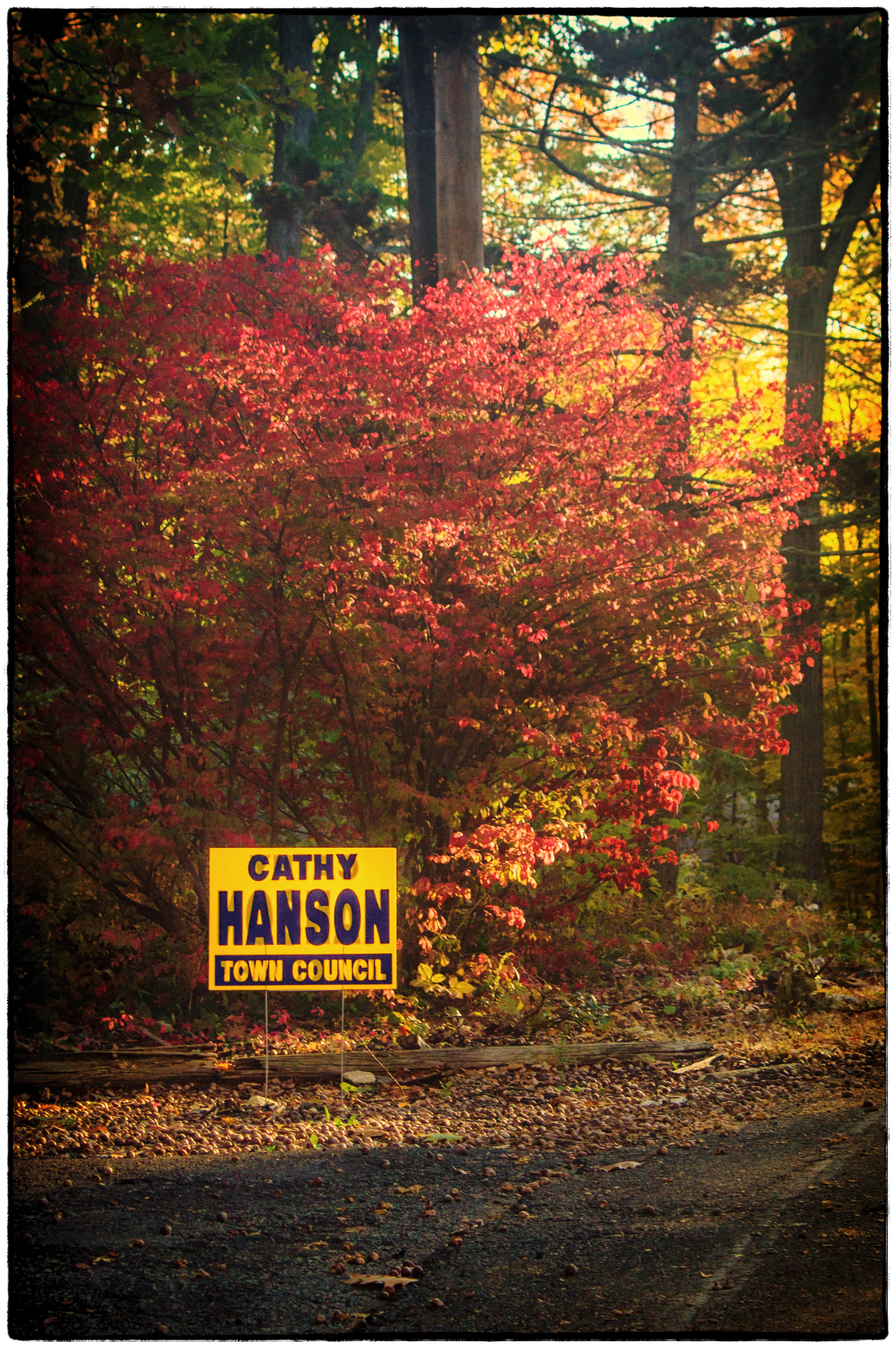 I don’t actually know who Cathy Hanson is. I understand from neighbors that she lives in our community, but I don’t think I’ve ever met her. What I was more interested in was the contrast between the bright yellow sign, and the reds of the shrub behind. Also the way that the strong back light illuminated both of them. The Kiron 28-70 mm lens flares really badly so I was pleasantly surprised to find that in this case, for once, the flare was something that I could live with.