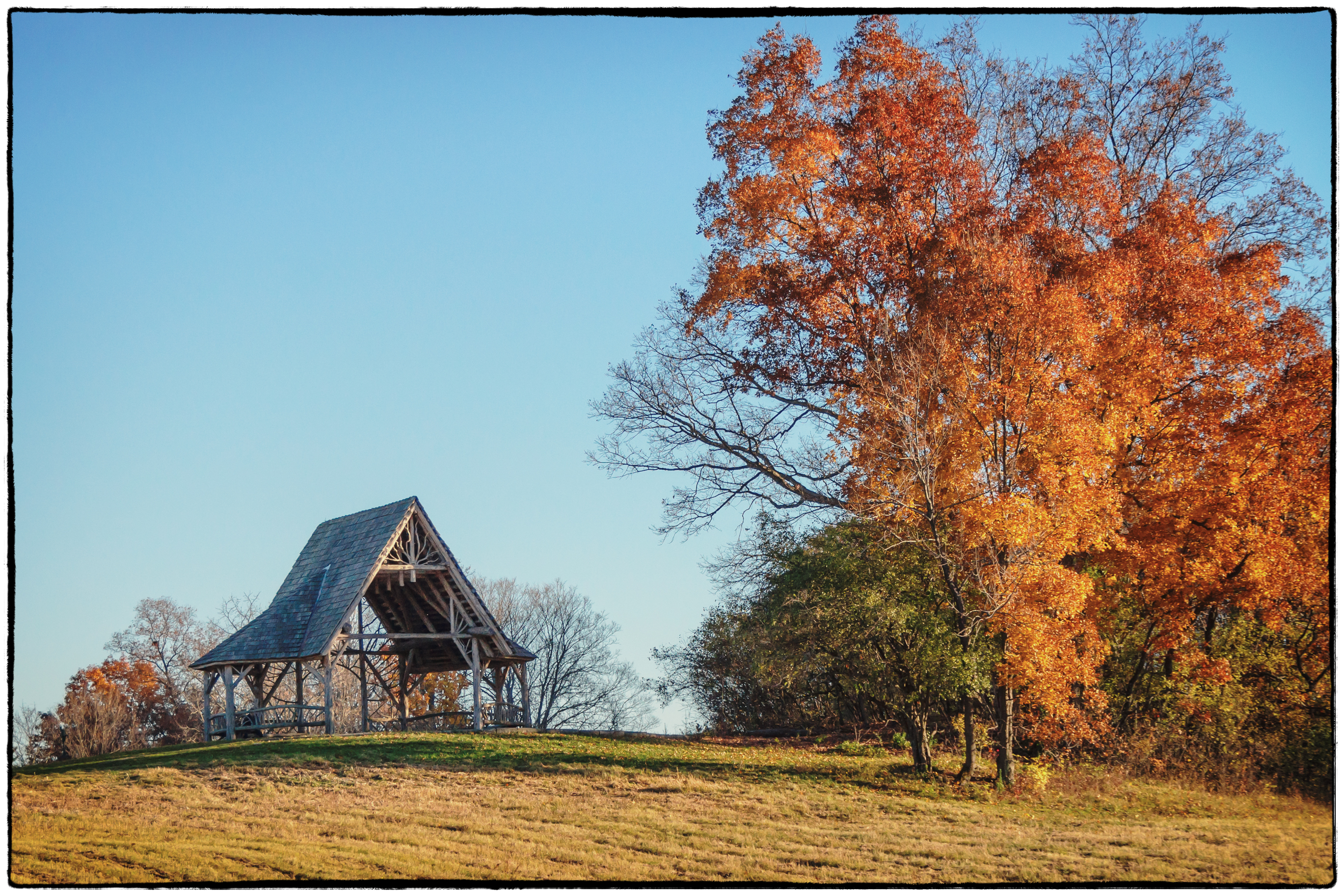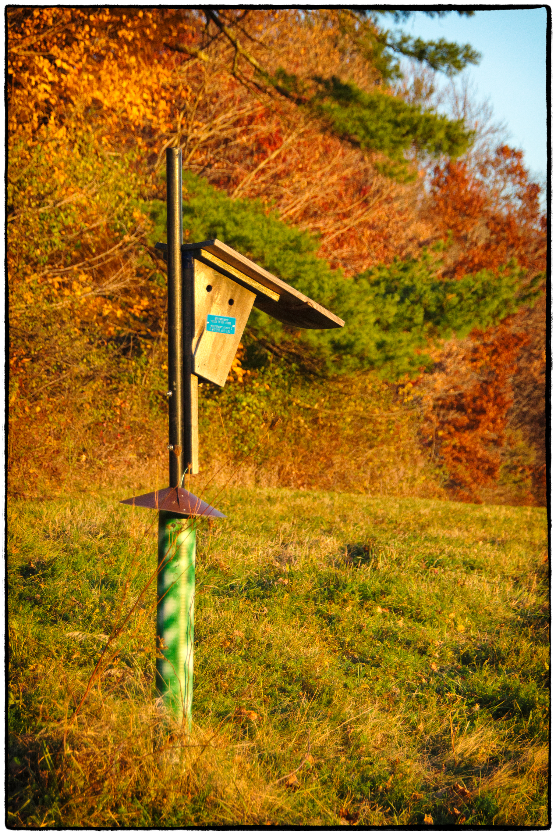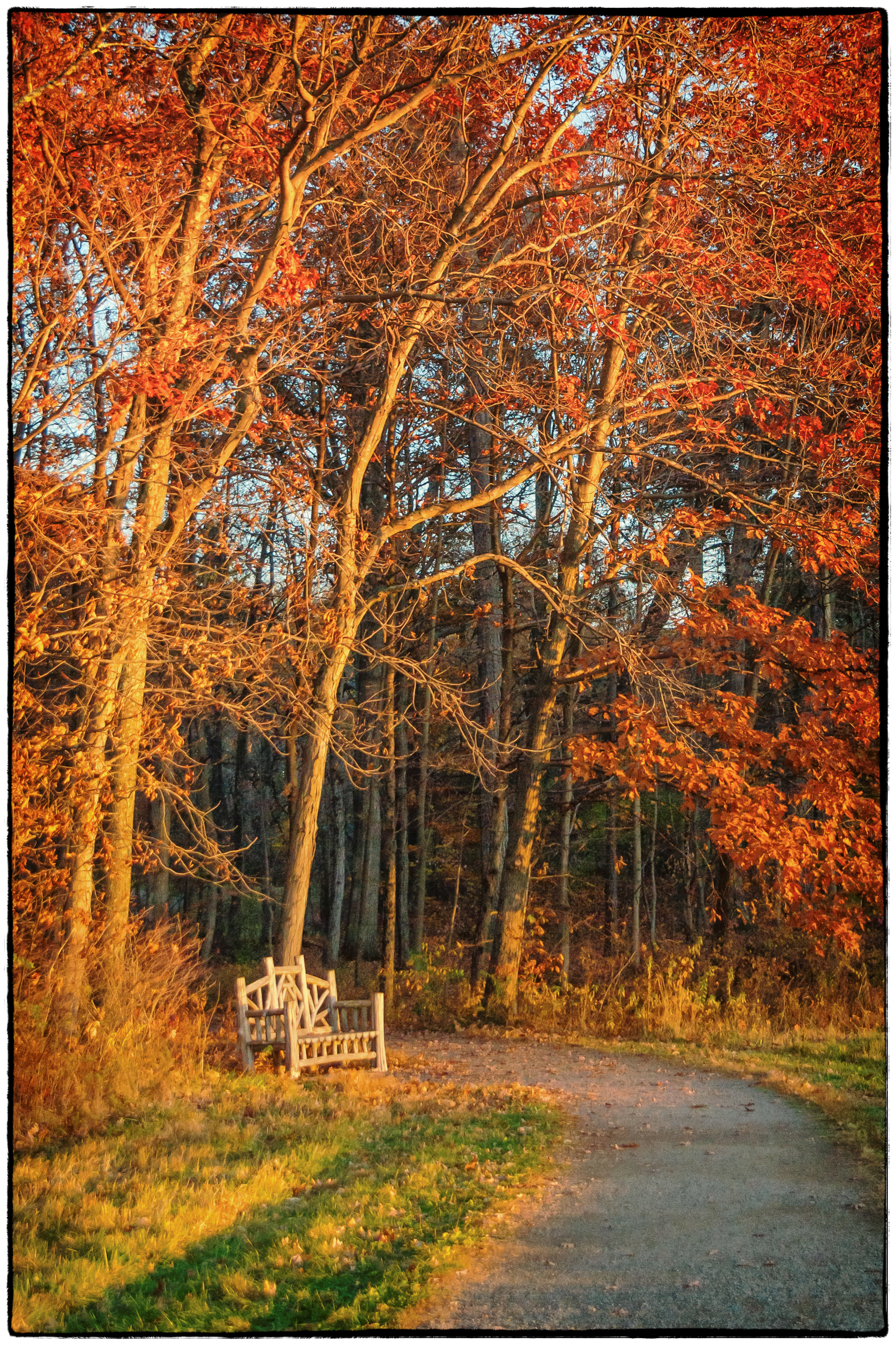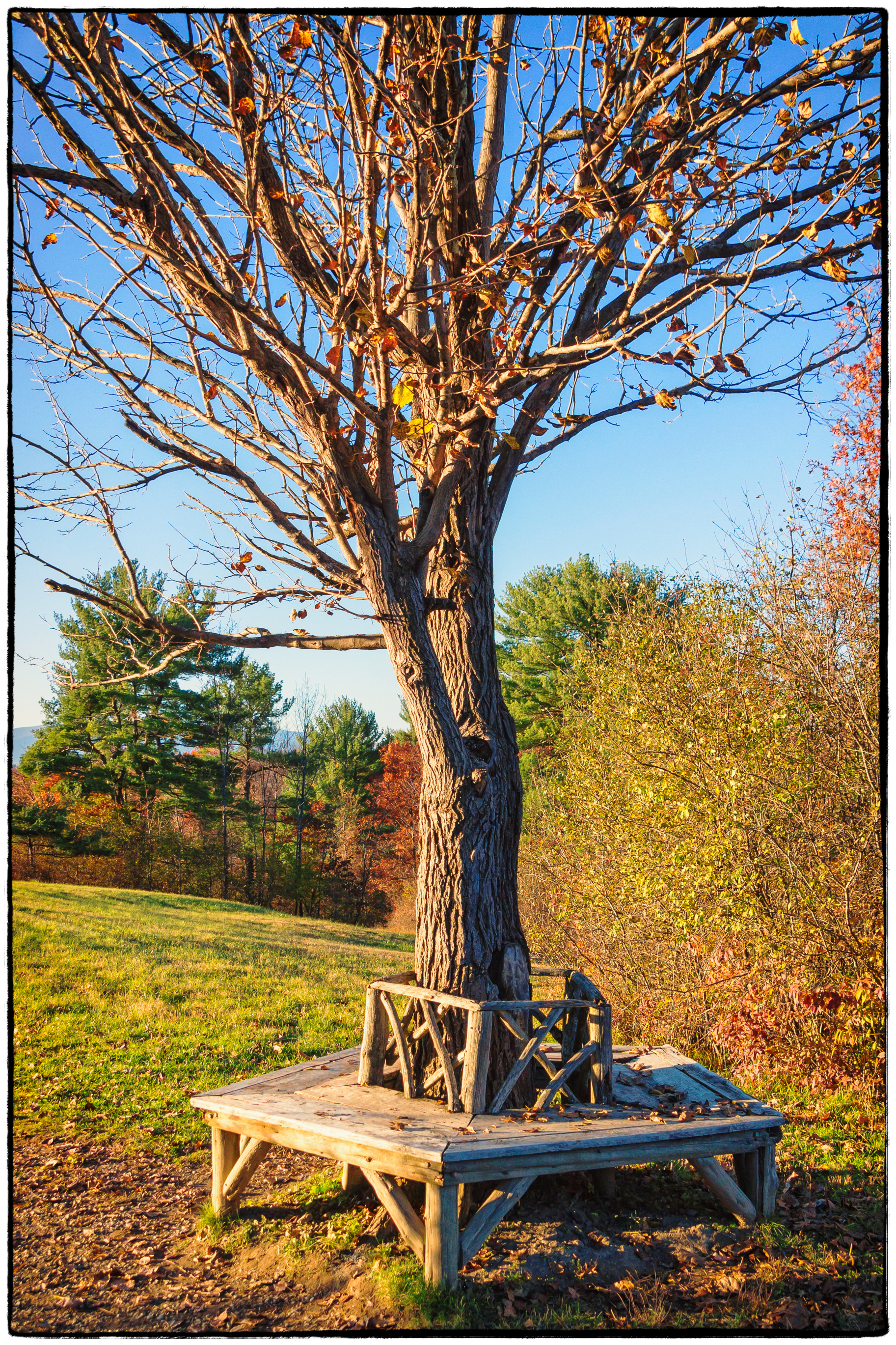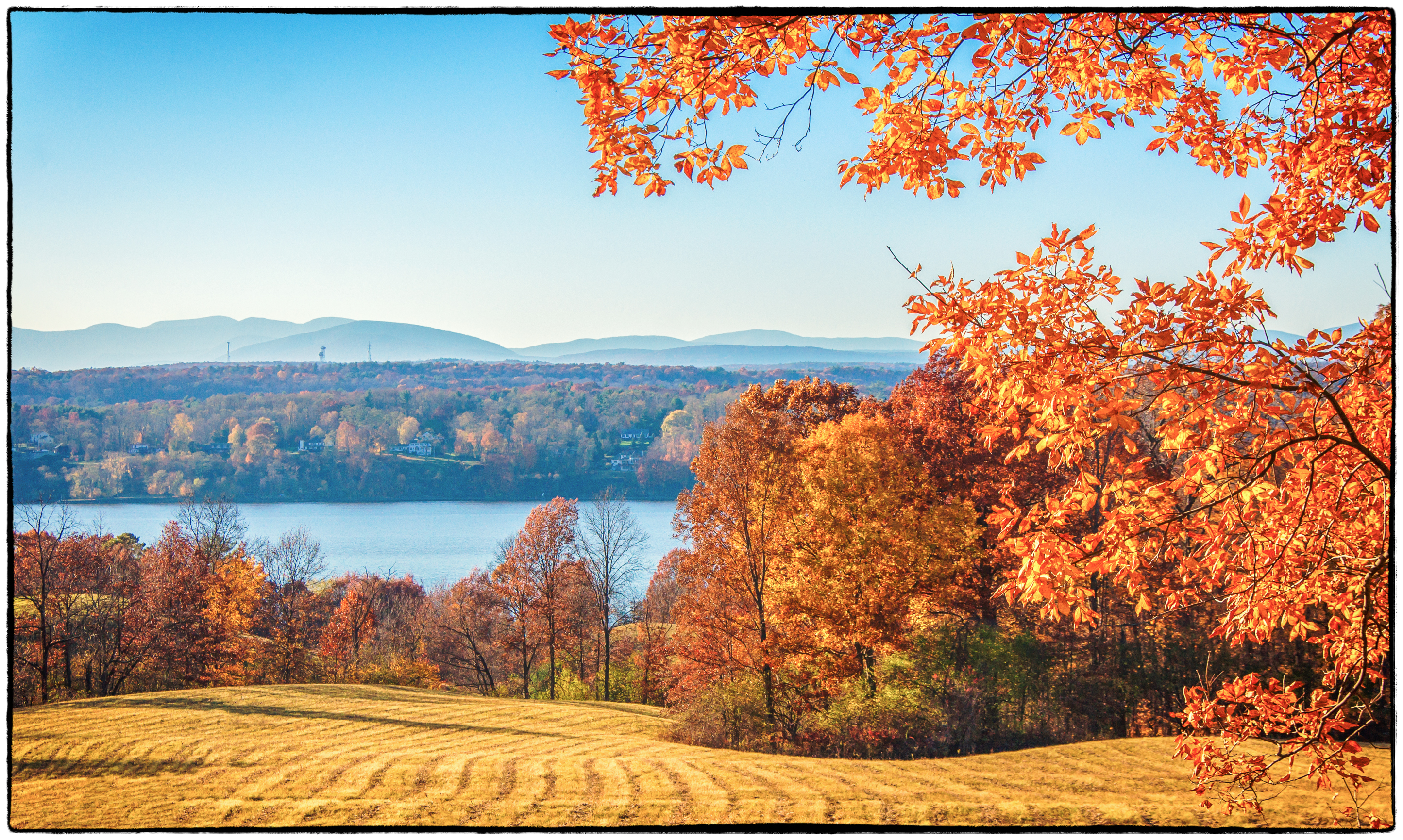 It was a gorgeous warm, sunny fall day with not a cloud in sight so we decided to venture north and take the dog for a walk at Poets’ Walk Park near Red Hook in Dutchess County, NY. I hadn’t been there before and found it most enjoyable – full of rolling meadows, interesting wooden structures and spectacular views out over the Hudson to the Catskill Mountains. There are only about two miles of trails divided into two parts. The first part takes you through meadows to The Overlook, a large rustic wooden structure. The second part is a bit more rugged, descending down through woods to the river and then ascending back again to near The Overlook. All told we walked for about two hours, a bit more than my wife (who isn’t much for walking in the woods) would have liked. We went towards the end of the day and the light was great.