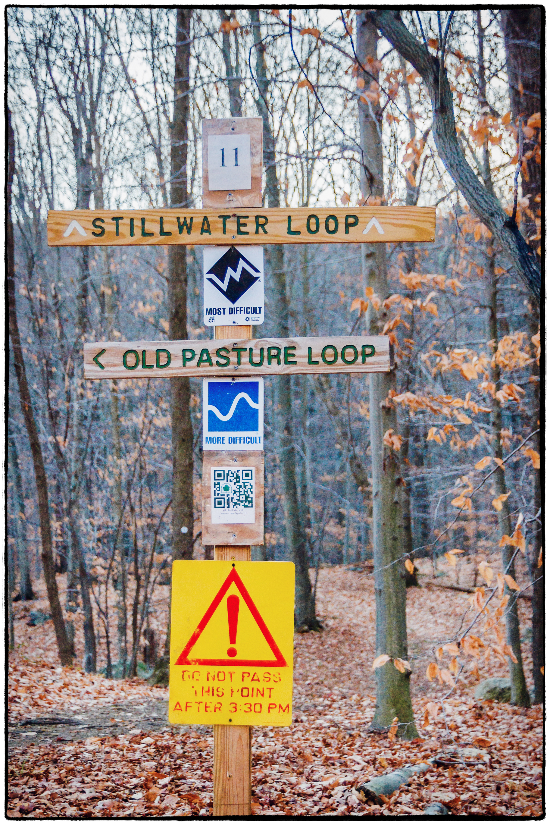 I was briefly intrigued by this signpost along the way, particularly the bright yellow sign at the bottom which reads: “Do not pass this point after 3:30 pm”. What are the dire consequences if your do? Is this when they let the monsters out? Do you turn into a pumpkin? Then it occurred to me that it’s probably because around this time of year it starts to get dark around 4:00pm and they don’t want people walking around in the woods in the dark. That’s probably wise as the trails can be quite treacherous and there are bear in the woods.