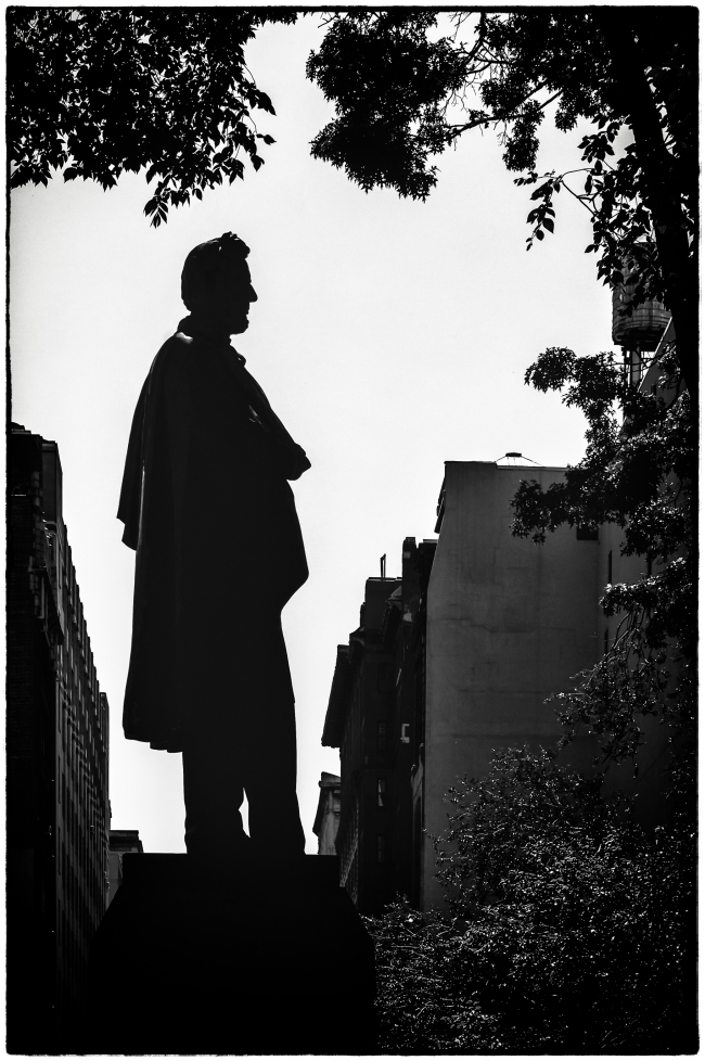 This was taken around 10:00 am and the light was already bright and contrasty. I thought I’d avoid the probably most common view of the statue i.e. from the front and take my picture from the side. The color didn’t add much value so I started to think in terms of black and white. I was having trouble with lack of dynamic range when the idea of a silhouette came to mind. I had a picture of those paper cutouts that were popular at one time. I could isolate the statue against the sky and frame it with the buildings and the leaves.