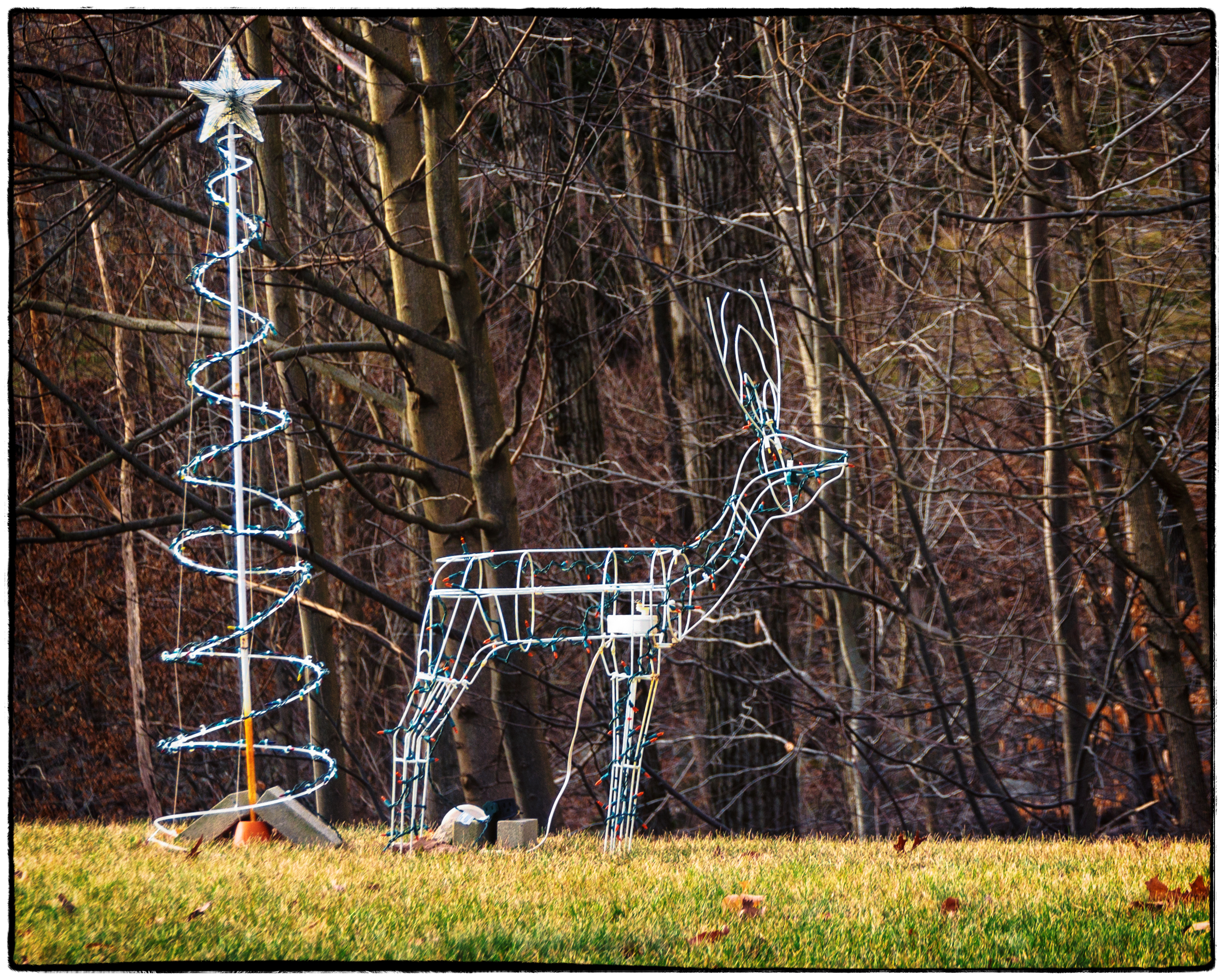 I’m not entirely sure why I like this photograph. It’s a bit misleading as it gives the impression that these ornaments are out the the woods when in reality they’re not too far away from a house. Still there were a lot of trees behind them and I suppose the intrusion of technology (e.g. the fairy lights) into this otherwise rural landscape caught my attention. I thought a lot about whether or not I should add this to the blog and at first thought that I wouldn’t. However, I found that I kept coming back to look at it and so decided to put it up.