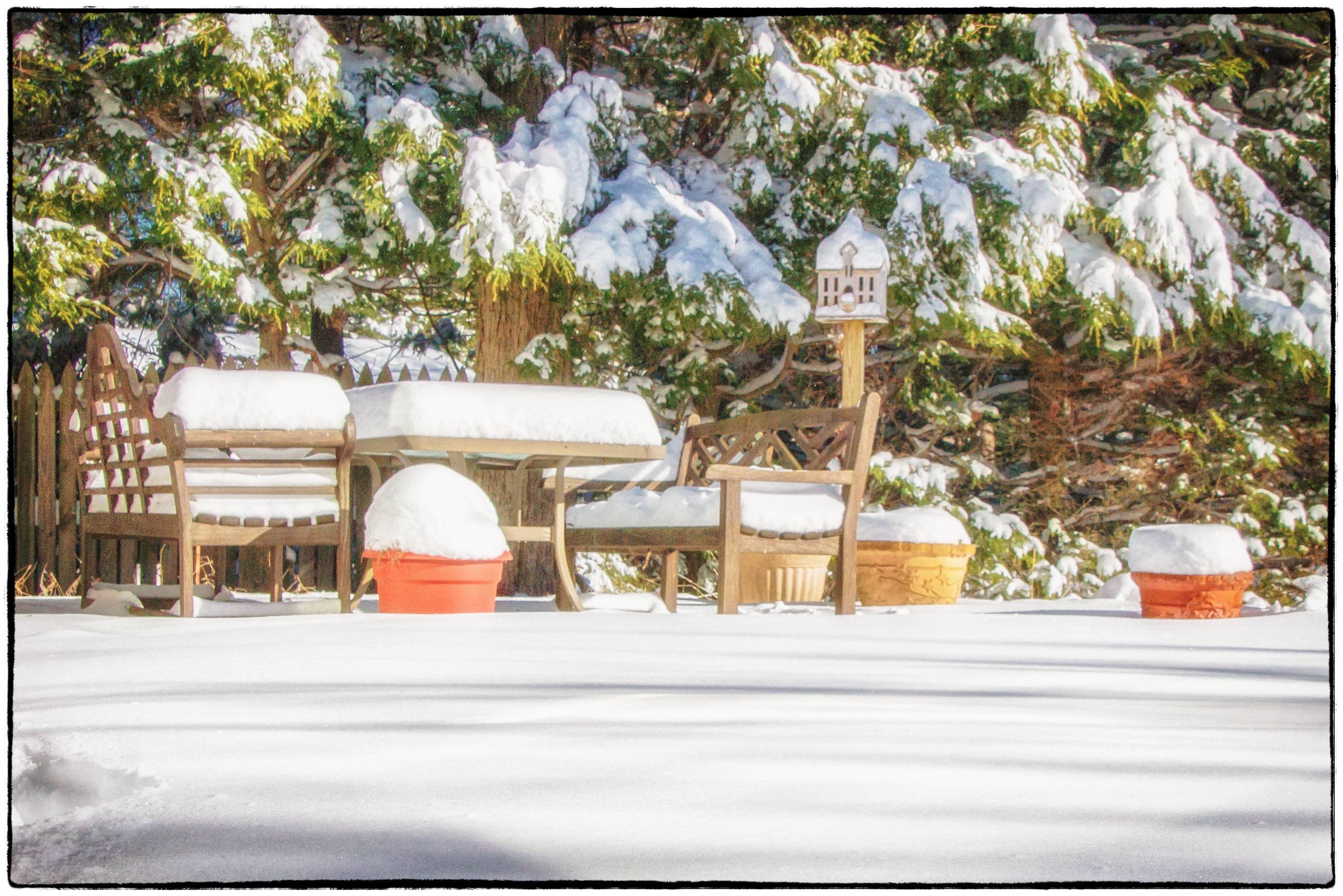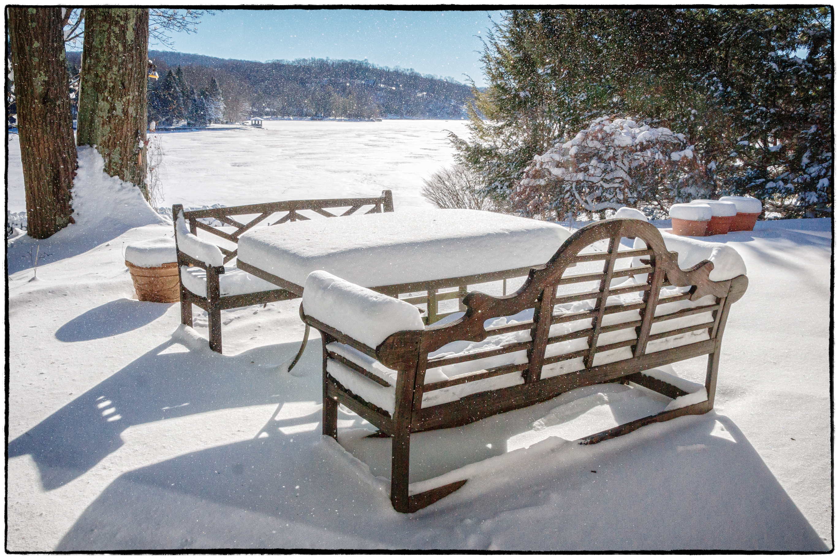 View across the snowy patio.