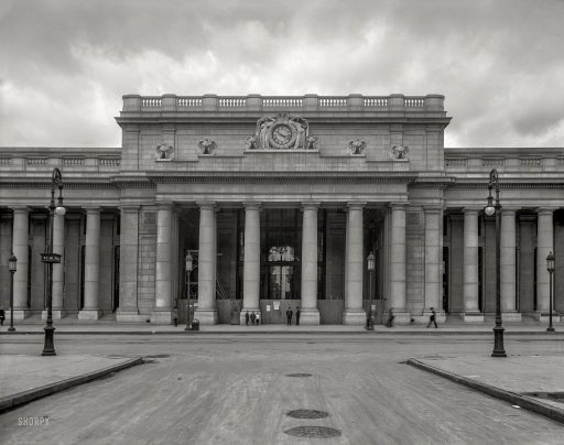 “Thirty-Second Street entrance, Pennsylvania Station, New York.” The original Penn Station in the final stages of construction, circa 1910. 8×10 inch dry plate glass negative, Detroit Publishing Company