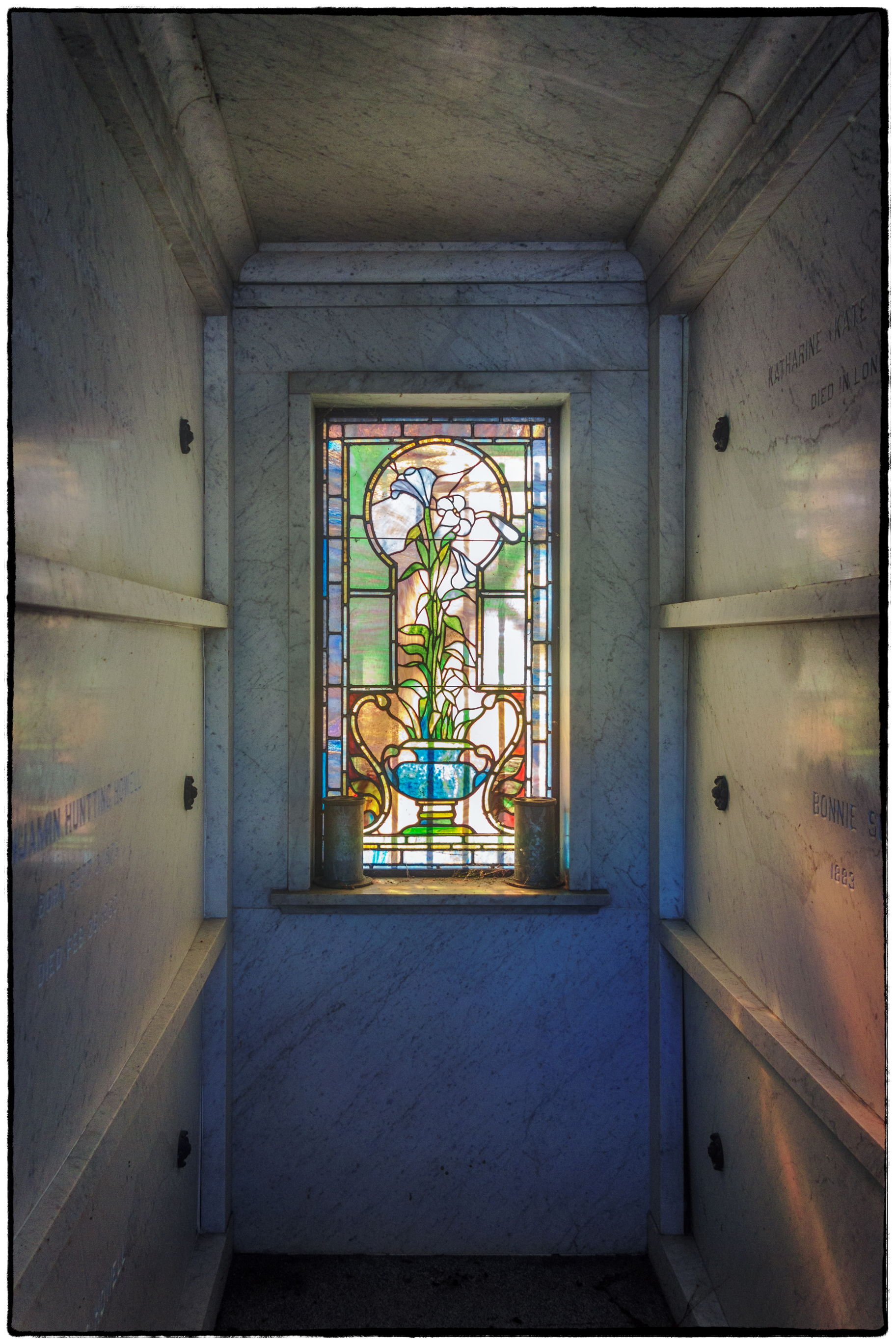 Another one from Sleepy Hollow Cemetery. I was walking the dog in the snow and I went behind this building. I noticed the stained glass window, which of course from the outside didn’t look too special. It occurred to me that if I went around to the front there might be a way of seeing into this mausoleum and getting the light shining through this window. Sure enough there was a entrance door with a couple of small windows. This is the view through one of the windows.