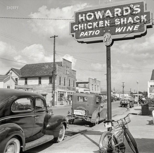 February 1943. “Daytona Beach, Florida. Street scene.” Howard’s Chicken Shack — we’re going to phone 9363 and see if they can deliver to 2016. Medium format negative by Gordon Parks for the Office of War Information.Source: Howard’s Chicken Shack: 1943