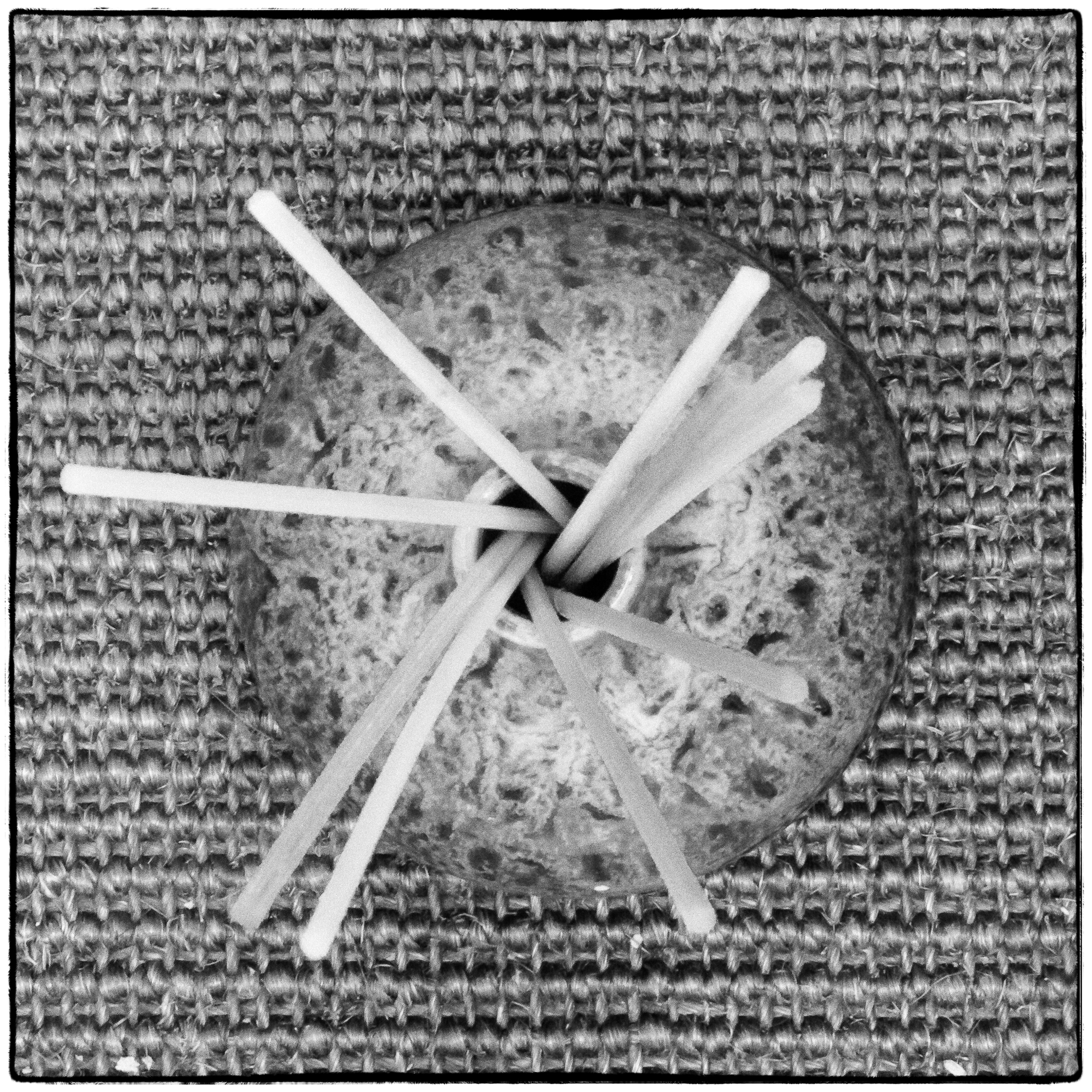 A different view of an everyday object: aerial view of an incense holder. Another picture that works better in color – mostly earth tones. The jar is quite colorful and the sticks are bright orange. The mat is a mixture of very light blues and yellows. I think it still works in black and white because of the varied shades and shapes as well as the well-defined textures (particularly of the mat).