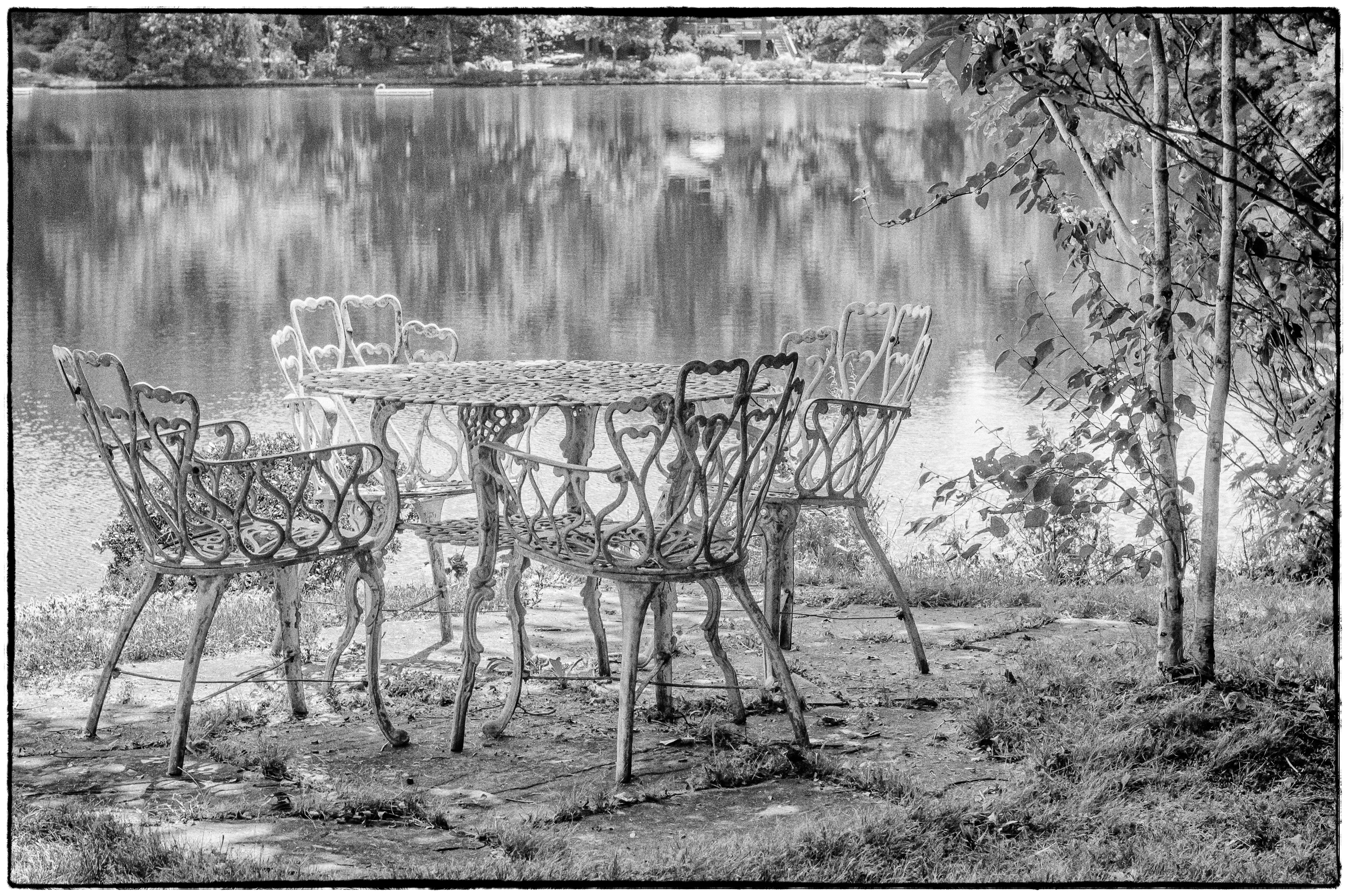 Lovely, slightly weathered wrought iron table overlooking our lake.