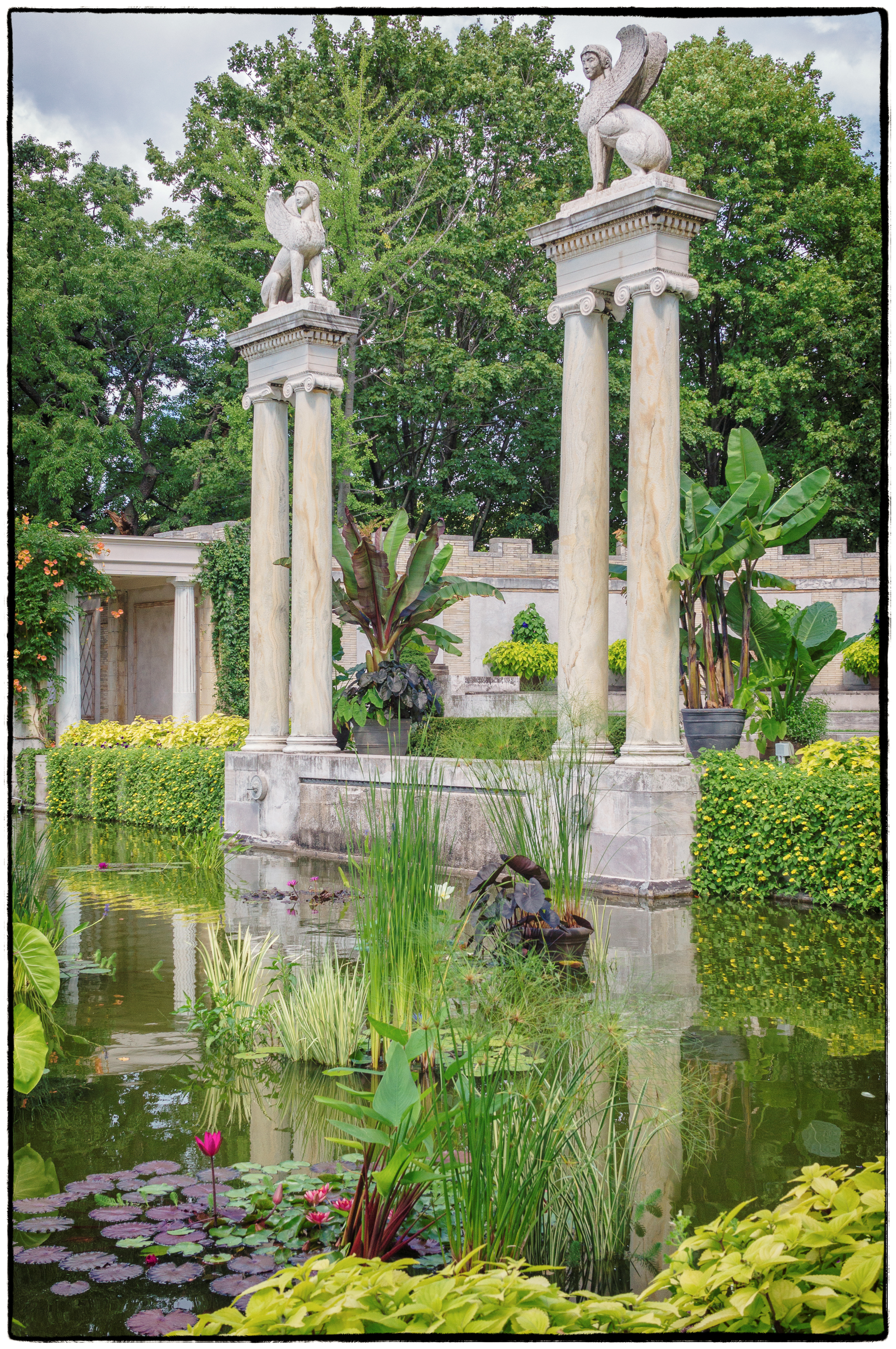 While the concept was Indo-Persian, the gardens at Greystone were appointed with Greek-inspired elements including the Temple of the Sky, a roofless circle of Corinthian columns topped by an entablature festooned with a classic palmette and anthemion design, the open air amphitheater where guests could be entertained by dancers, musicians or poetry, and the stoa where one could relax.