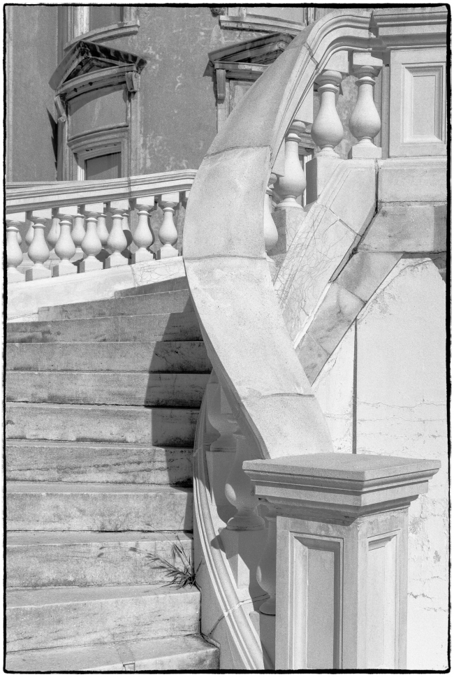 I liked the curving banister and steps; the repetition of the stone balusters; the contrast between the lighter foreground elements and the darker building in the background; and the stone textures.