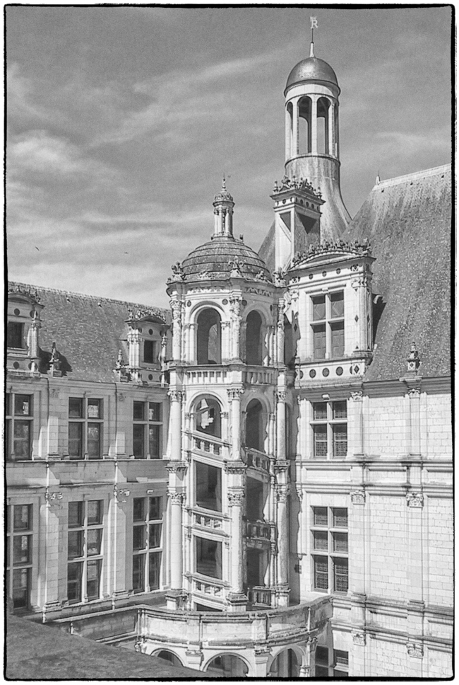 Taken in 2002 with a Canon Powershot S10 compact 2.1 megapixel camera at Chambord Castle during a very pleasant vacation in the Loire Valley. Chambord is particularly famous for a “double helix” spiral staircase, but I believe that this isn’t it (the famous one is inside the castle while this one is outside). It’s still pretty impressive though – as is the rest of the castle, particularly the exterior. The interior is rather bare and cheerless.