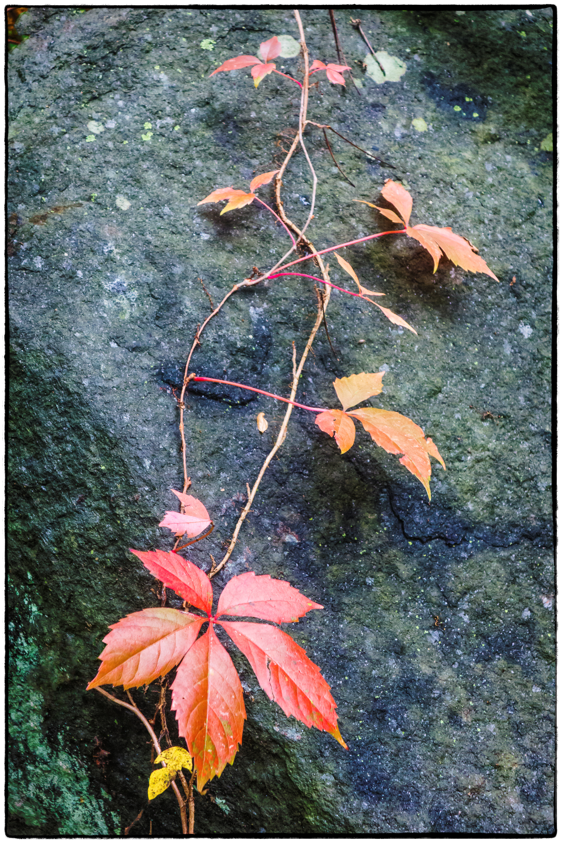 I was attracted to the bright colors (mostly red, orange and yellow) of the vine (especially the leaves) contrasted with the darker shades (mostly dark grey, green and blue) of the rock. It was an overcast day and I liked the even, non-contrasty light.