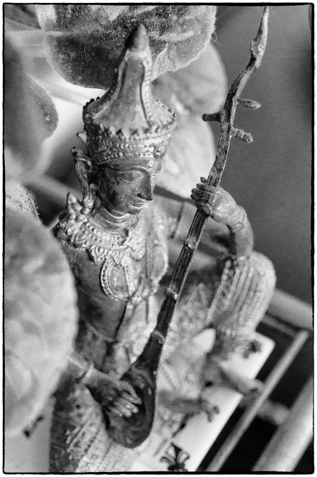 We have three of these small statuettes on a small pyramid shaped shelving unit in our living room. Right next to it is a slightly taller mirror-fronted armoire on which I’m accustomed to leaving cameras so the cat can’t get at them (it’s a little bit too tall even for her, and in any case she’s shown no inclination to try to get up there. Probably for the best since if she did try to get up there she’d probably cause damage). When we have visitors my wife doesn’t like my cameras to be out in the open so I have to remove them. On this particular day I happened to glance down and notice this figure. I’d seen it many times before, but never from this particular angle. I liked the way it was peeping out from between the leaves of a couple of african violets – like some exotic figure in the jungle. I was trying to keep the face in focus while blurring the foreground and background and I pretty much succeeded I think. If I could change anything I’d try to get the figure’s right hand in focus too.