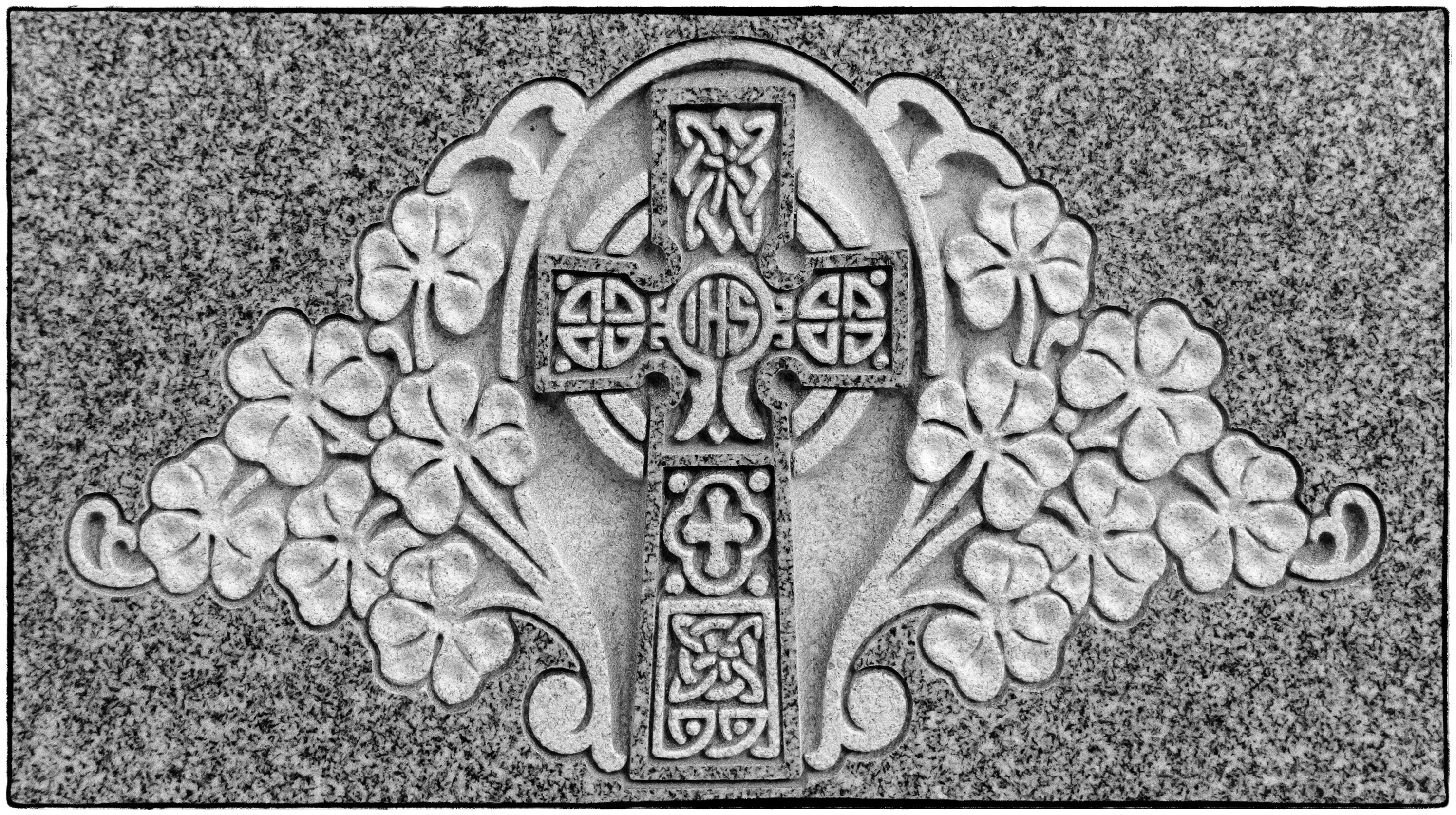 One of the relatively few interesting gravestone designs in this cemetery with a celtic cross and shamrocks (I think).