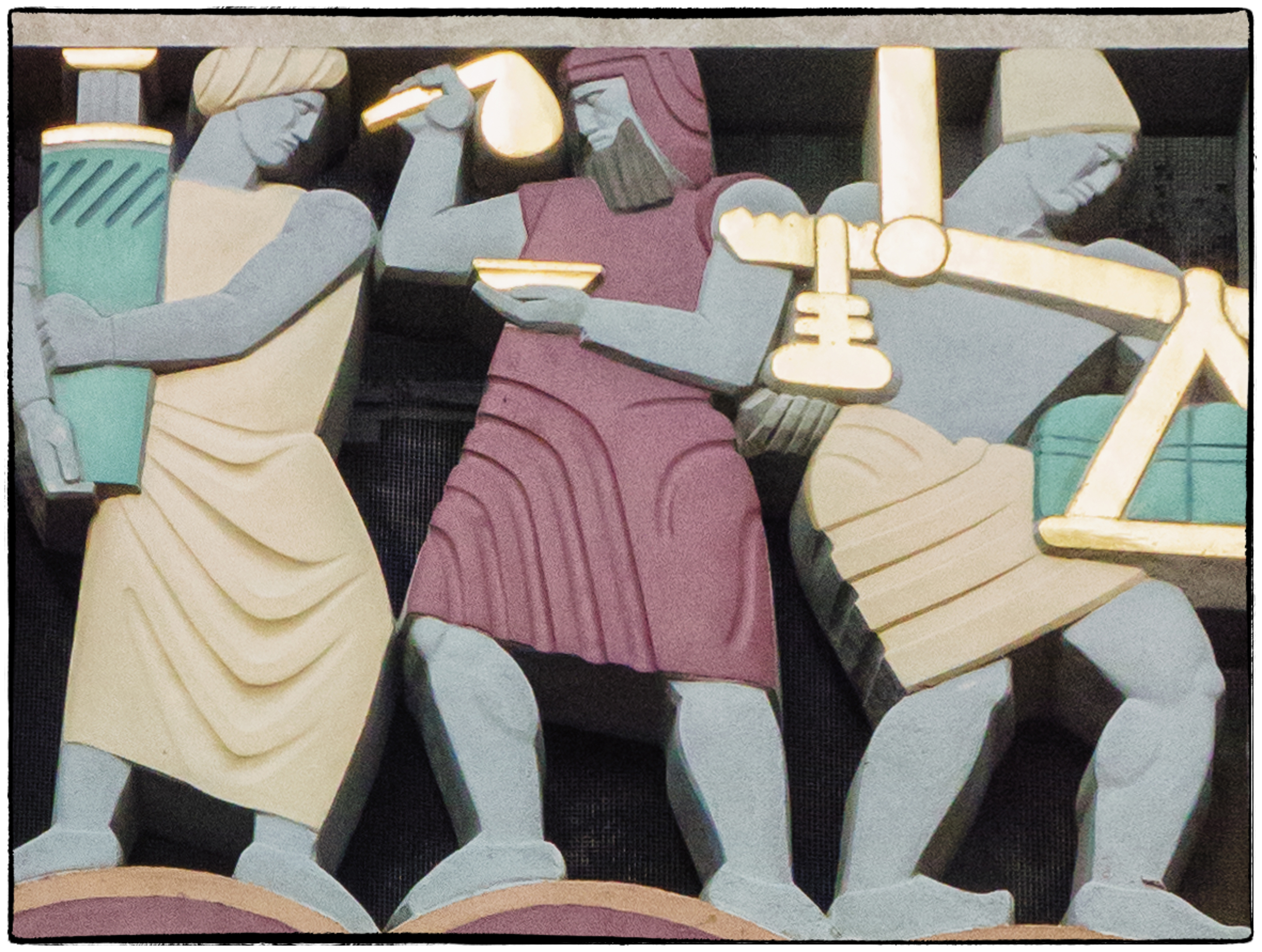 Lee Lawrie‘s The Story of Mankind, a massive carved limestone Art Deco sculptural grill has adroned the entrance to the International Building at 29 West 50th Street, since its installtion in September 1937. Serving a dual purpose–chronicling the progress of mankind, as well as symbolizing the purpose of the International Building, Lawrie divided the screen into fifteen small rectangular spaces contained carved images he called “hieroglyphs.”