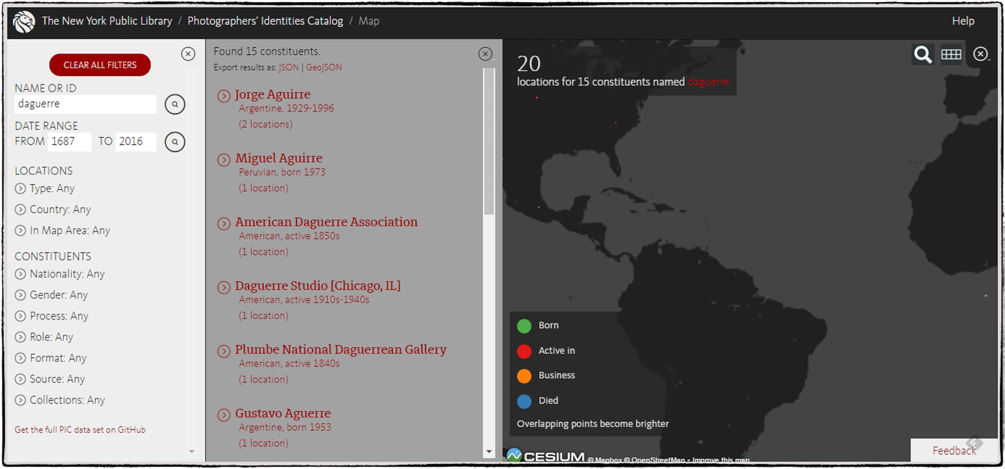 The interface allows you to filter according to a number a criteria: Name or ID; Date Range (year); Location (Type e.g. birth; Country or Geographical Area; In Map Area); Nationality; Gender; Process (e.g. Autochrome); Role (e.g. Collector or Dealer); Format (e.g. Panoramic Photographs); Source; Collections.