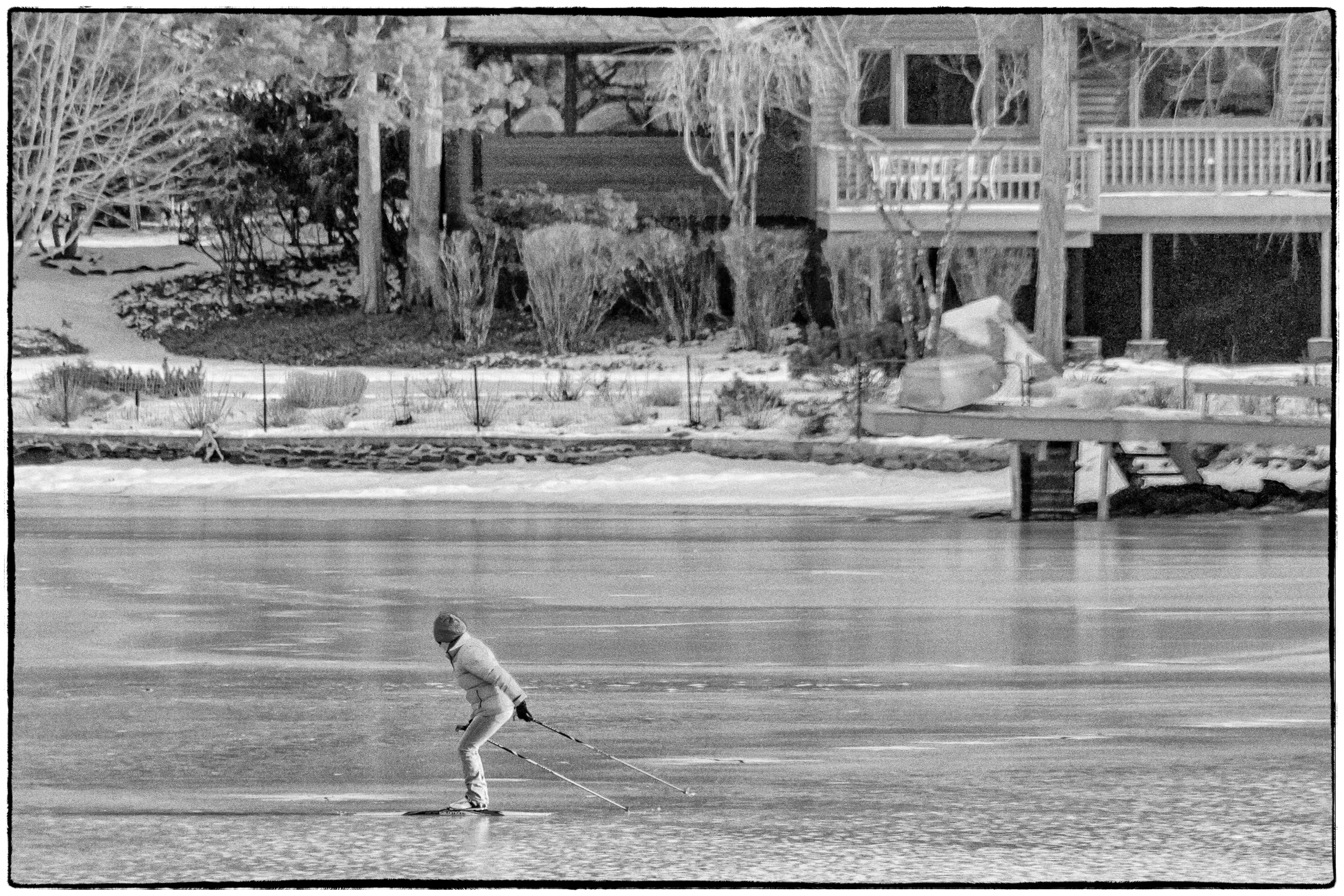 My wife was in the living room when she noticed some movement on the lake. It turned out that it was this woman skiing on the lake. I grabbed a camera and went out to take a picture – in my haste almost falling over on the icy, still partly snow covered lawn. Apparently the woman in the picture is not concerned with the possible danger.