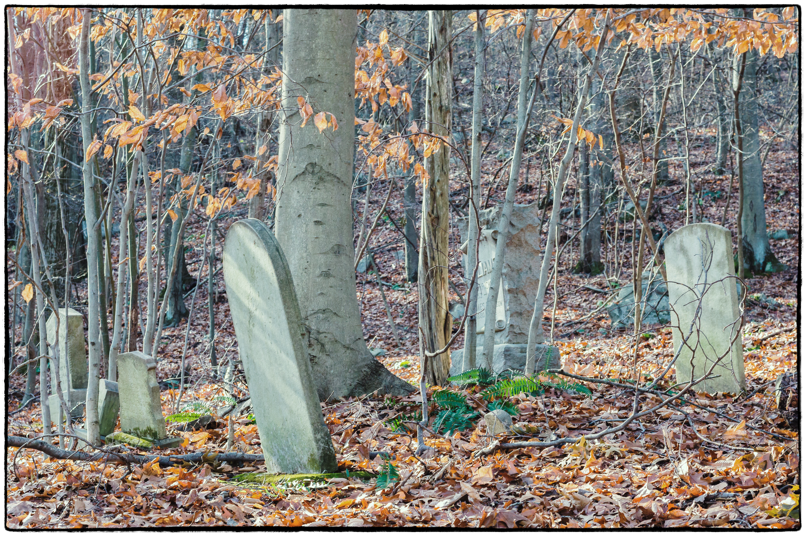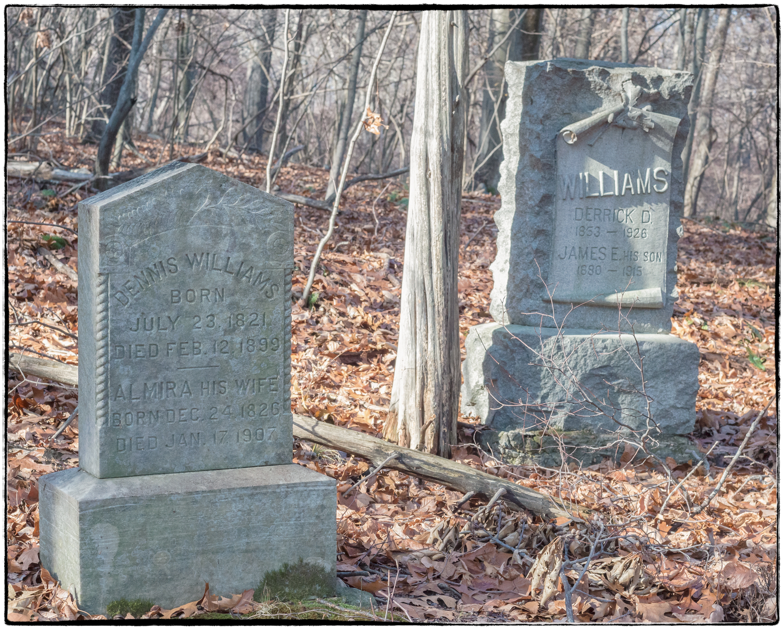 There are only a few graves and it’s pretty much your typical small cemetery in the woods. The only grave marker that I found of interest was the one on the right in the picture below. It has an interesting raised scroll and what look to me like oak leaves (According to Douglas Keister in Stories in Stone. A Field Guide to Cemetery Symbolism and Iconography: “oak leaves can symblolize many things including strength, endurance, eternity, honor, liberty, hospitality, faith and virtue”).