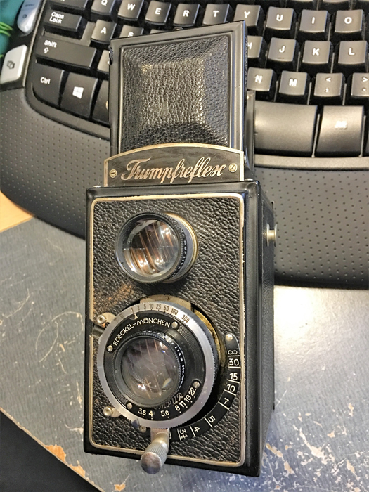I’d never heard of this camera before. It turns out that it’s an export version of the Richter Reflecta, made c1940 in Germany and sold in the United States by Sears. Focus (helical) is controlled by the lever at the lower right, and the viewing and taking lenses are coupled behind the faceplate. It appears to be worth from $50 (in average condition) to $140 (in mint condition).