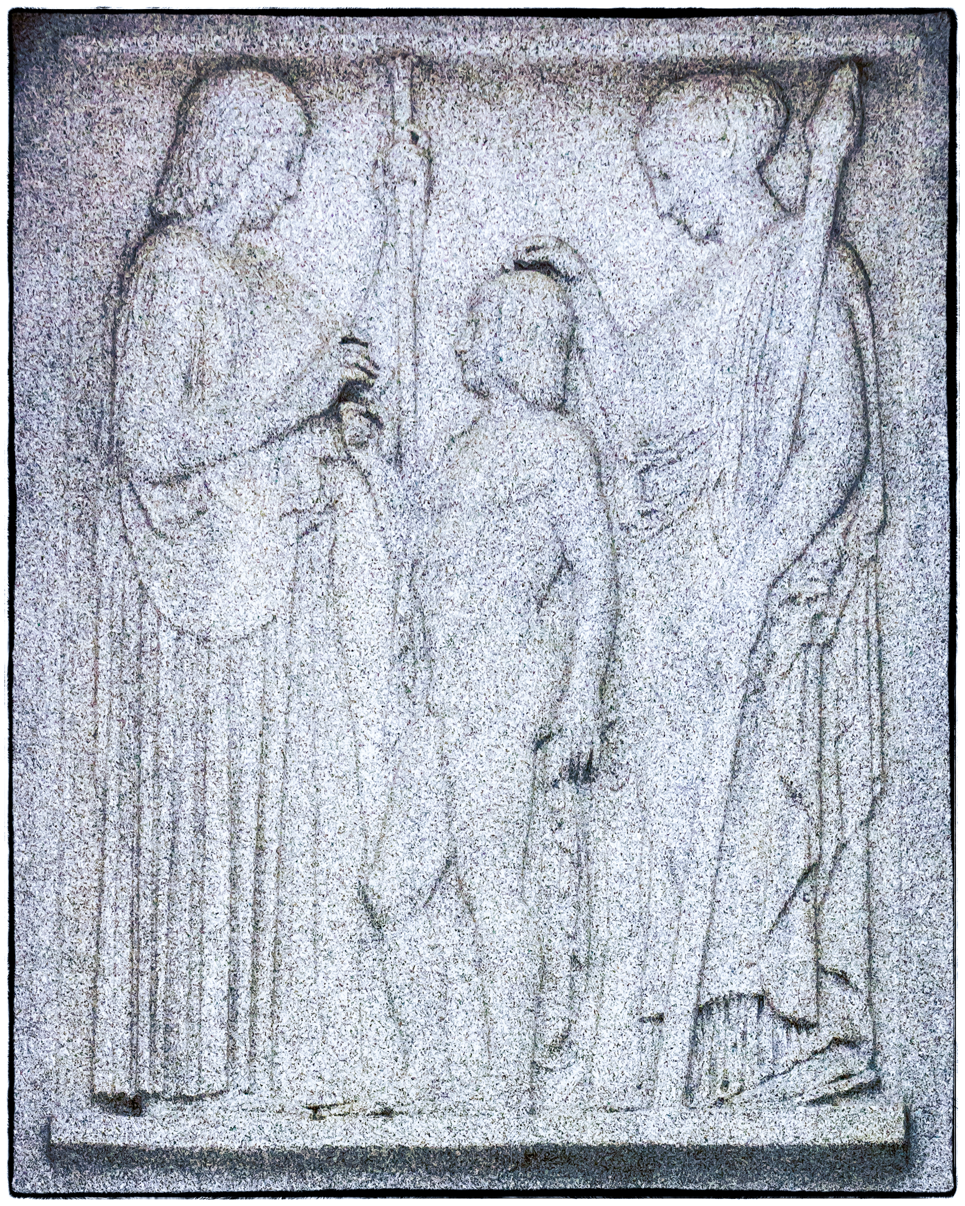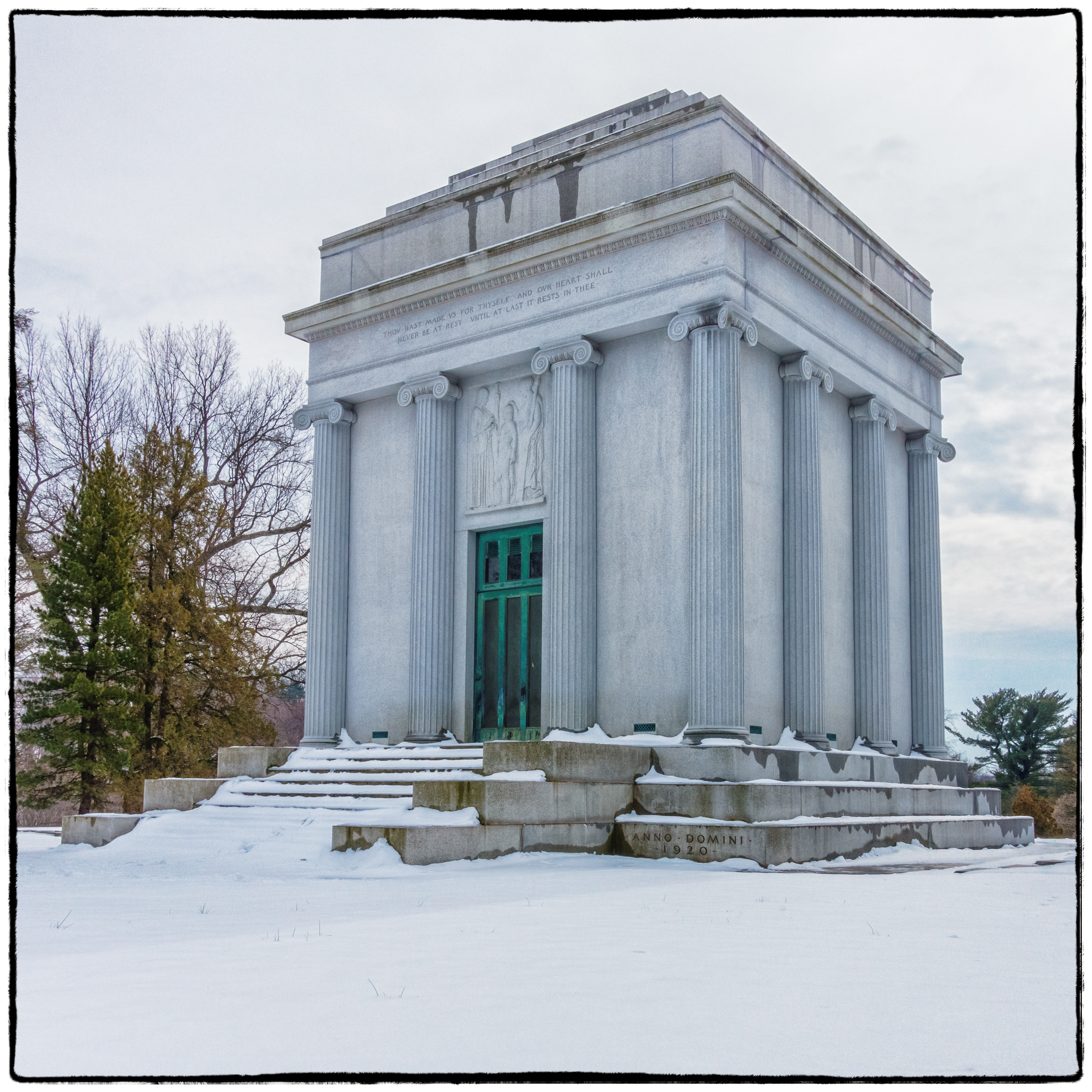 The Presbrey-Leland Company, one of the premier monument builders of the time, executed the actual construction of the mausoleum. The firm still operates today. Overseeing the project was monument builder William Crawford. Crawford chose Barre, Vermont granite for all the structural elements. Of special note is the 10-foot wide, 30-foot long 14-inch thick granite walkway that was carved from a single slab of granite. Inside the mausoleum there are 20 wall crypts. The cella (interior space of the mausoleum) is 12 feet by 18 feet 2 inches. In the cella are two marble sarcophagi for William and Almira Rockefeller. Other architectural details include a bronze door and other bronze details fashioned by the William H. Jackson Company of New York and slate crafted by the Structural Slate Company of Pen Argyl (argyl is Greek for slate rock), Pennsylvania). The bas-relief above the entry has been attributed to French born sculptor Gaston Lachaise. A number of granite-covered graves of other members of the extended Rockefeller family pepper the lawn area outside the mausoleum. Despite the mausoleum’s grand scale and prominent siting, William Rockefeller kept his name low key. Rather than have his name in bold letters in the frieze area over the entry he chose to modestly place it on the lower step of the stylobate (out of view on the far left; it echoes the anno domini 1920 on the lower step of the stylobate on the far right right).