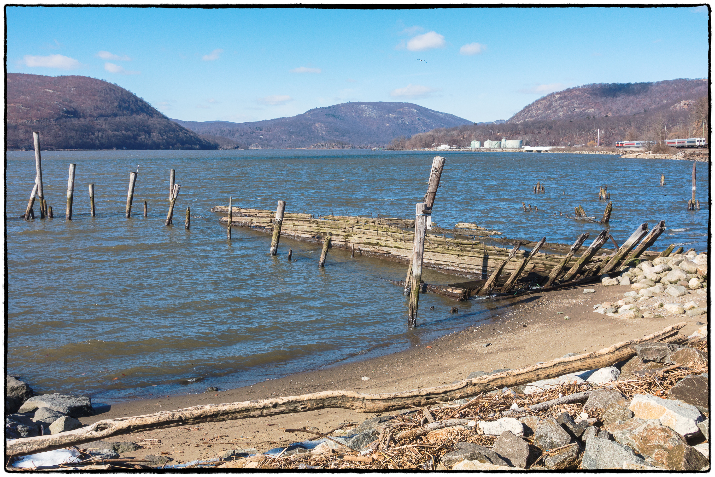 A similar view to the one above, but with the remains of a pier and possibly a boat in the foreground. A Metro-North train passing on the right.