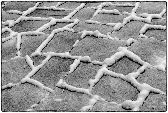 Our last snow fall came after a period of abnormally warm weather so the ground was quite warm. This meant that initially the snow stuck mostly on the grassy/mossy areas rather than on the paved areas. From this arose these interesting snow patterns. As the snow continued I imagine the paved areas cooled down and eventually the snow was sticking to them too and everything became white.