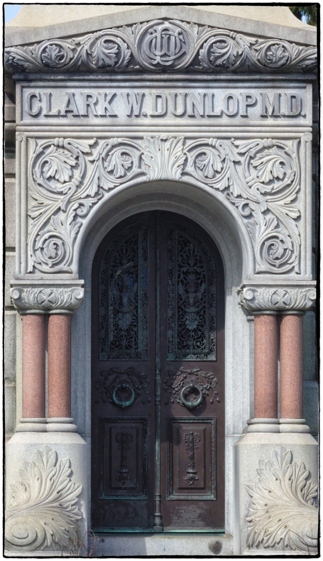 Dr. Clark Dunlop was financially successful, but died in sad circumstances. He made his fortune from a medical manual (Dr. Dunlops Family Practice), and a number of patent medicines including Dr. Dunlops King of Pain, and Dr. Dunlop’s Cascara Compound (a laxative). He made enough money to be able to build this exotic mausoleum. According to Douglas Keister on Mausoleums.com: