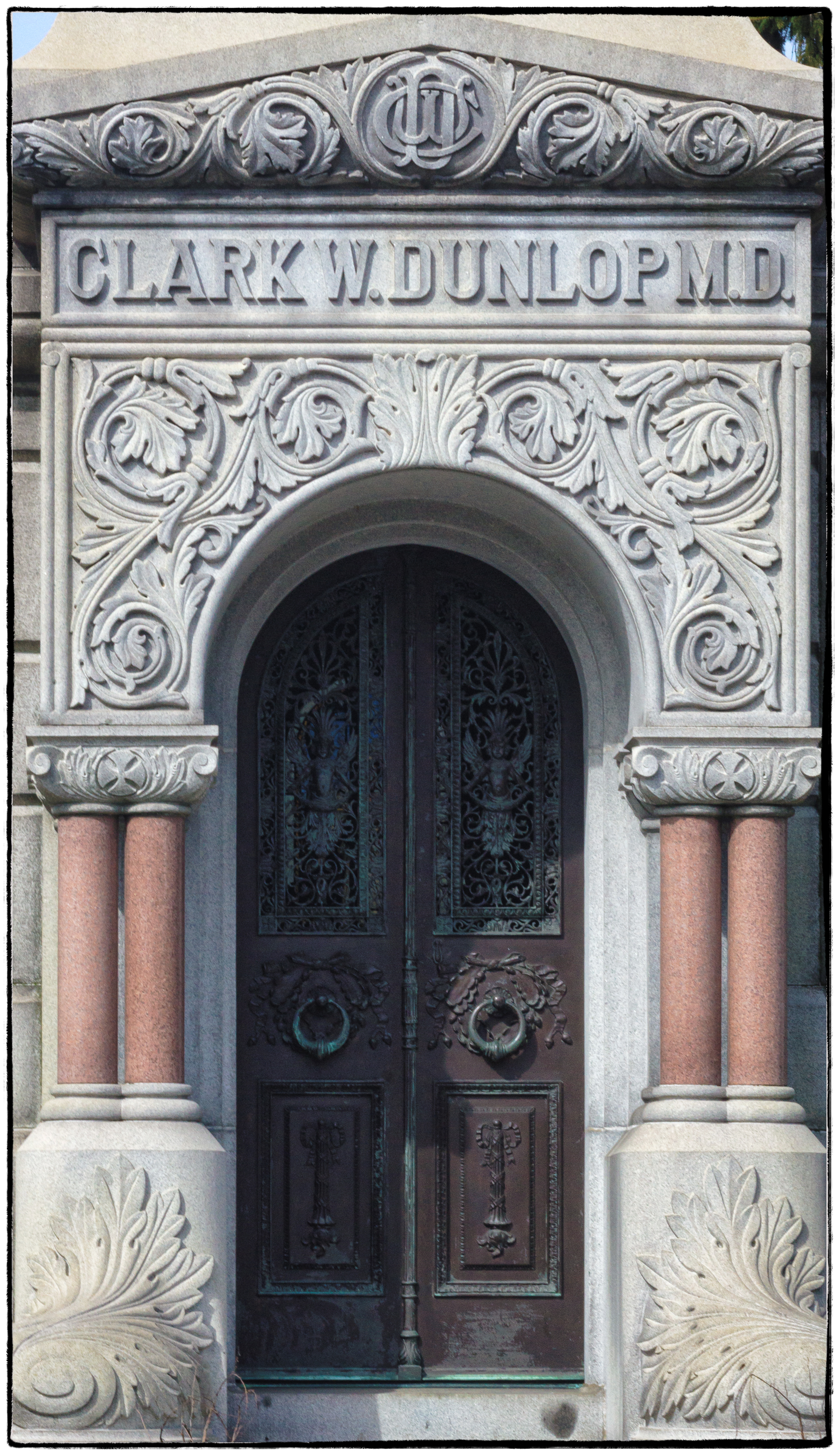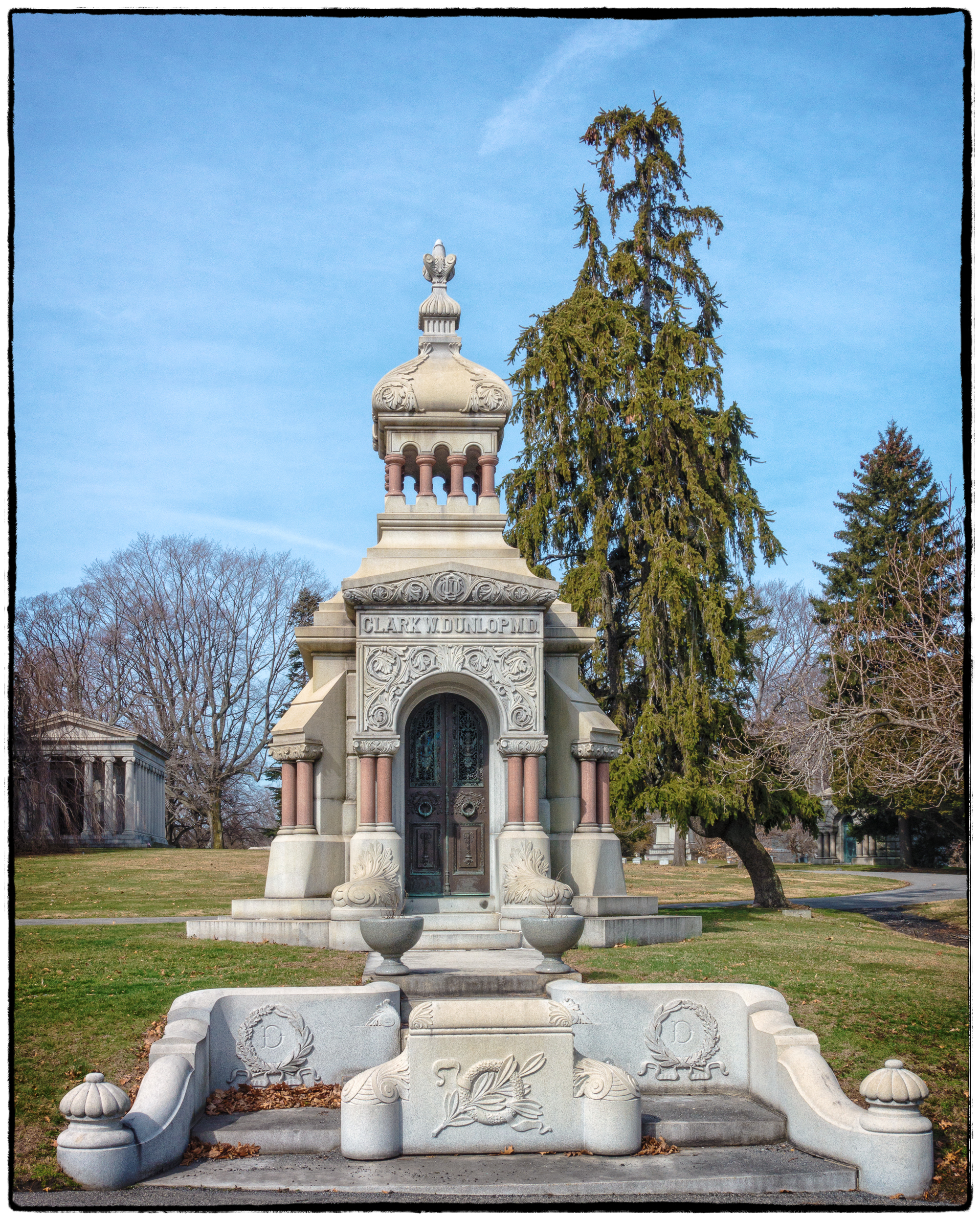 The mausoleum, which is more of a confection than a piece of architecture, was built by prominent mausoleum builders C. E. Tayntor & Company. The company quarried granite in Maine and Vermont and had offices in New York. It is difficult to put the Dunlop mausoleum into any specific architectural category. It has elements of Islamic and Byzantine and Classical Revival architecture. Then there is the curious feathery plinth flanking the steps.