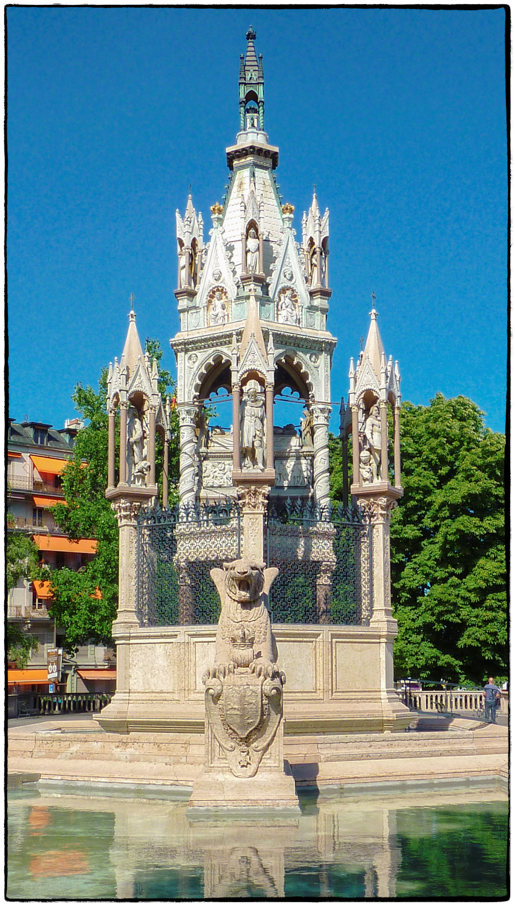 When I saw this tomb I recalled from my days living in Geneva another similar, although more gothic in style, canopy tomb: The Brunswick Monument (see below) – itself a copy of the Scaliger Tombs in Verona, Italy. This tomb was built in 1879 for Charles II, Duke of Brunswick (1804 – 1873). It stands right next to Lake Geneva near to the Mont Blanc bridge (Pont de Mont Blanc). The story that is told in Geneva is that he left his fortune to the City of Geneva on the condition that he be entombed facing the lake. The story went on to say (and I don’t know if this part can be verified) that the the fortune turned out to be less than anticipated so they placed him facing away from the lake rather than towards it. See: Lake Geneva 2004 – View from my hotel room for the kind of view that the Duke would have wanted. The monument is right next to the hotel I stayed in).
