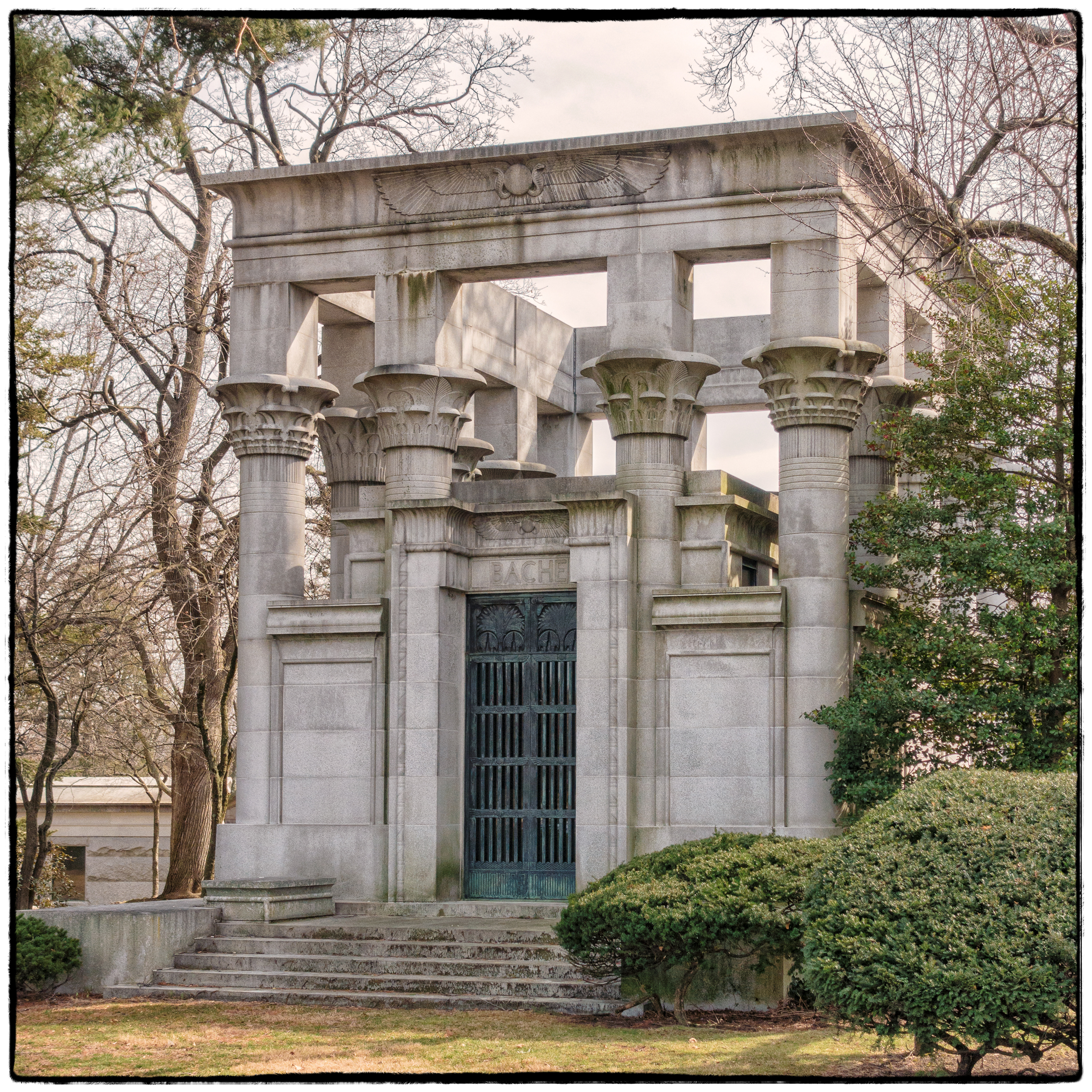 His tomb reflects his interest in the arts. He chose as his mausoleum, a replica of the elegant Kiosk of Trajan or “pharaoh’s bed” at the temple of Isis on the island of Philae on the Nile River. Bache’s Kiosk of Trajan was designed by Davis, McGrath & Kiessling in 1916 and fabricated of Barre granite by Farrington Gould & Hoagland The hallmarks of the Bache mausoleum are the 14 massive columns which are capped with abstractions of lotus blossoms (signifying the unfolding creative universe) and the open roof design. A winged solar disk which is associated with divinity and royalty is carved above the lintel. The winged sun is also symbolic of the soul. When placed above doors it served as a reminder to visitors of the eternal nature of their soul. The landscaped lot was designed by Charles Wellford Leavitt in 1918. Leavitt’s original design was quite Spartan and meant to reflect the aridity of the Egyptian climate. The Bache mausoleum and its grounds were featured in a 1917 article in Architectural Review magazine on mausoleum architecture, and in a 1921 article titled “Planting the Mausoleum Plot” in Park and Cemetery, magazine. It also appeared in the “Portfolio of Current Architecture” in the May 1920 issue of Architectural Record, and on covers of Park and Cemetery magazine in April, May, June and July 1932.