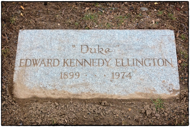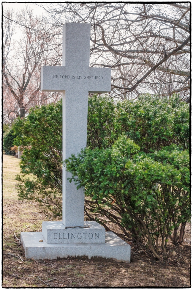 The monument is a little more complex than the photos above suggest. There are actually two crosses, one on each side of a hedge. Directly in front of the hedge is a magnificent tree and in front of that are a number of grave markers (including Ellington’s own; Duke’s parents James Edward Ellington and Daisy Kennedy Ellington; and Evie Ellington (Beatrice Ellis). Evie and Duke were never married, but they were together for the rest of their lives) like the one in the first picture.